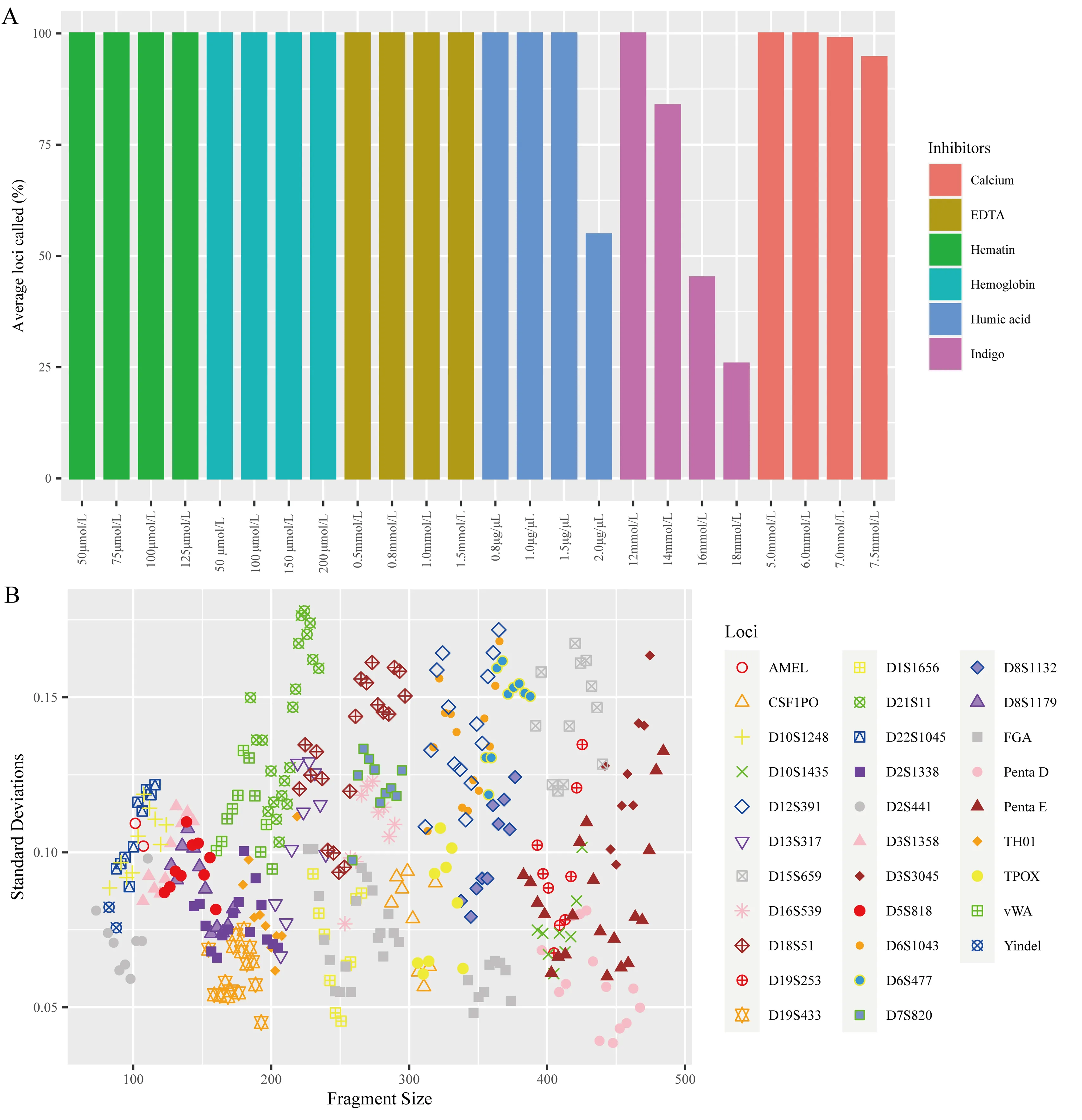 . (A) The average call rate for six common inhibitors of hematin, hemoglobin, EDTA, humic acid, indigo, and calcium with different concentrations mixed in control DNA 9948. (B) The precision of the 29-plex STR multiplex system across 24 injections on a 3500XL Genetic Analyzer.