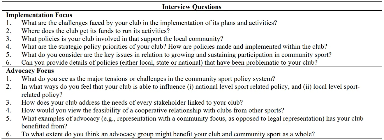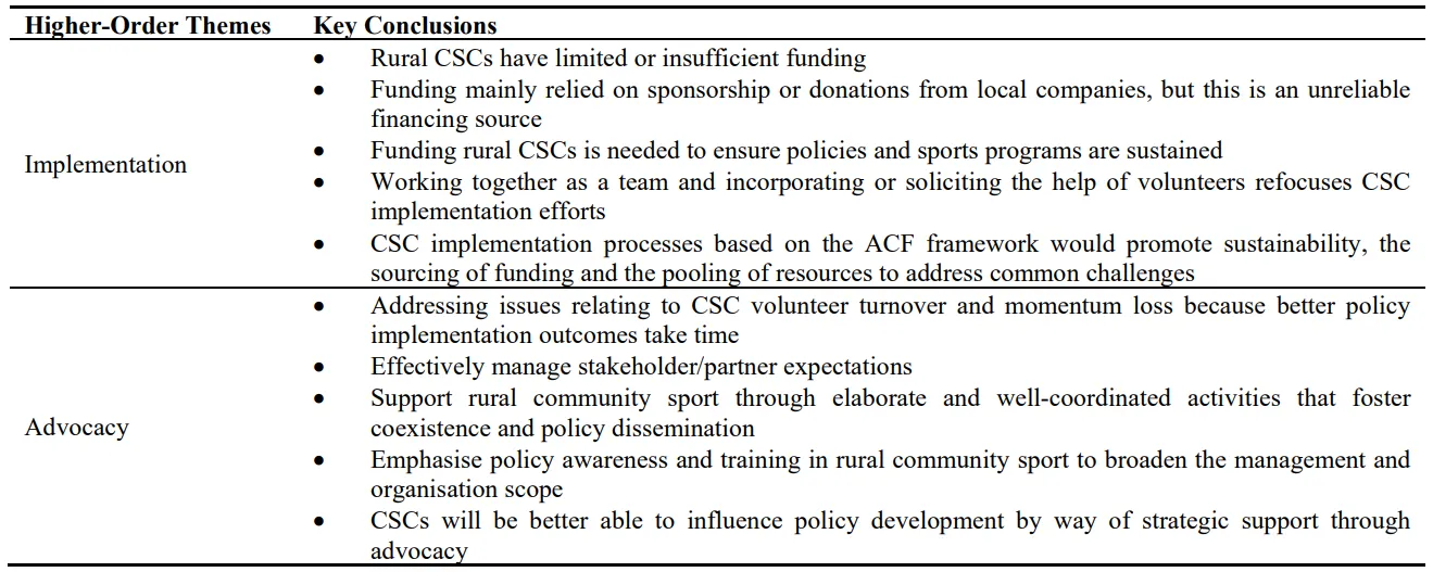 is there potential to contemplate an advocatorial environment for policy influence and change? This latter question is a fundamental consideration of how policy frameworks like the ACF—and the aspect of bottom-up policy influence—might apply to advocacy for community sport and encourage a more inclusive policy environment from the perspective of CSCs. Overall, the key findings contribute to a greater understanding of CSC concerns and opinions on the viability of localized advocacy and its influence within an Australian rural context.