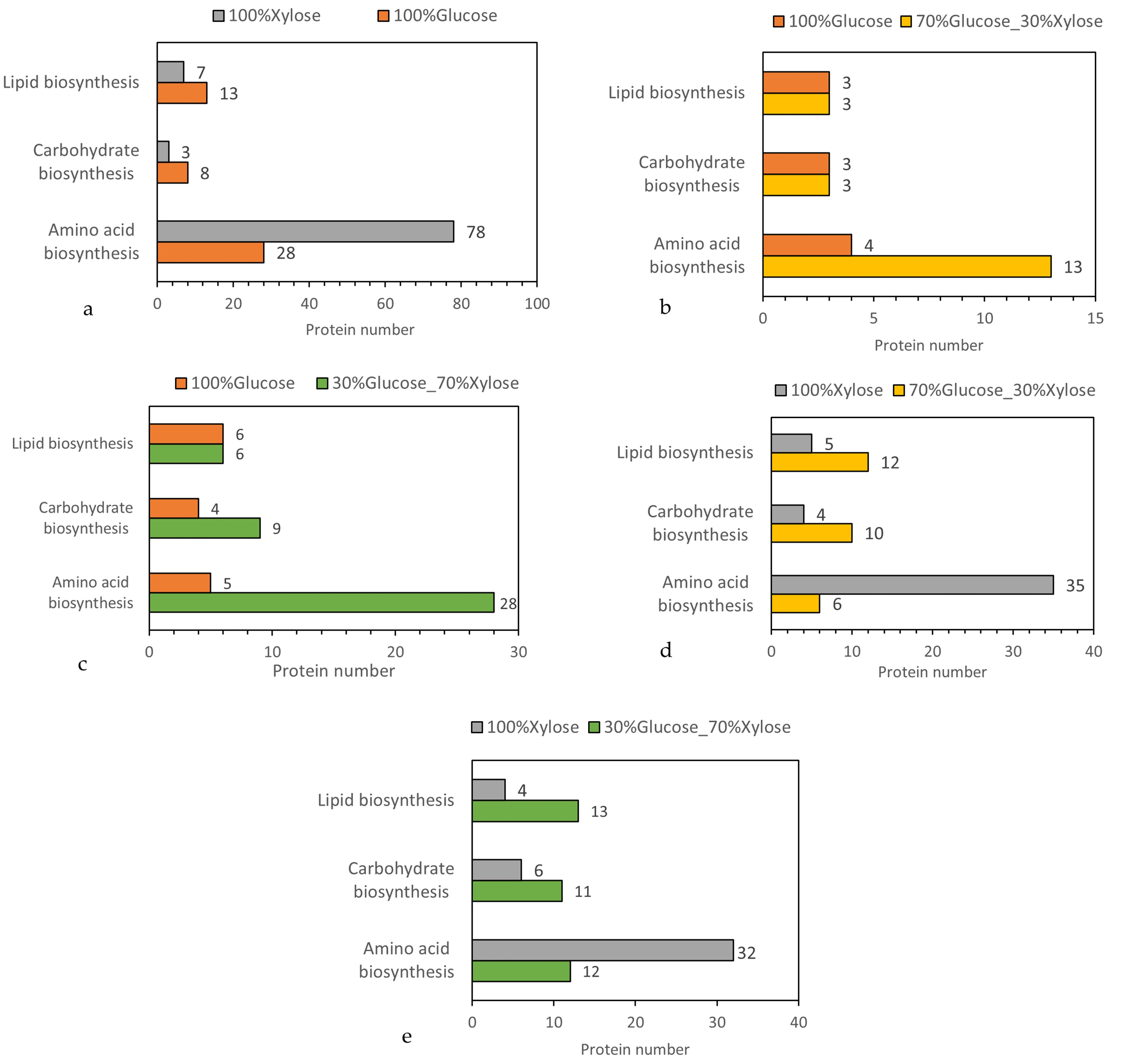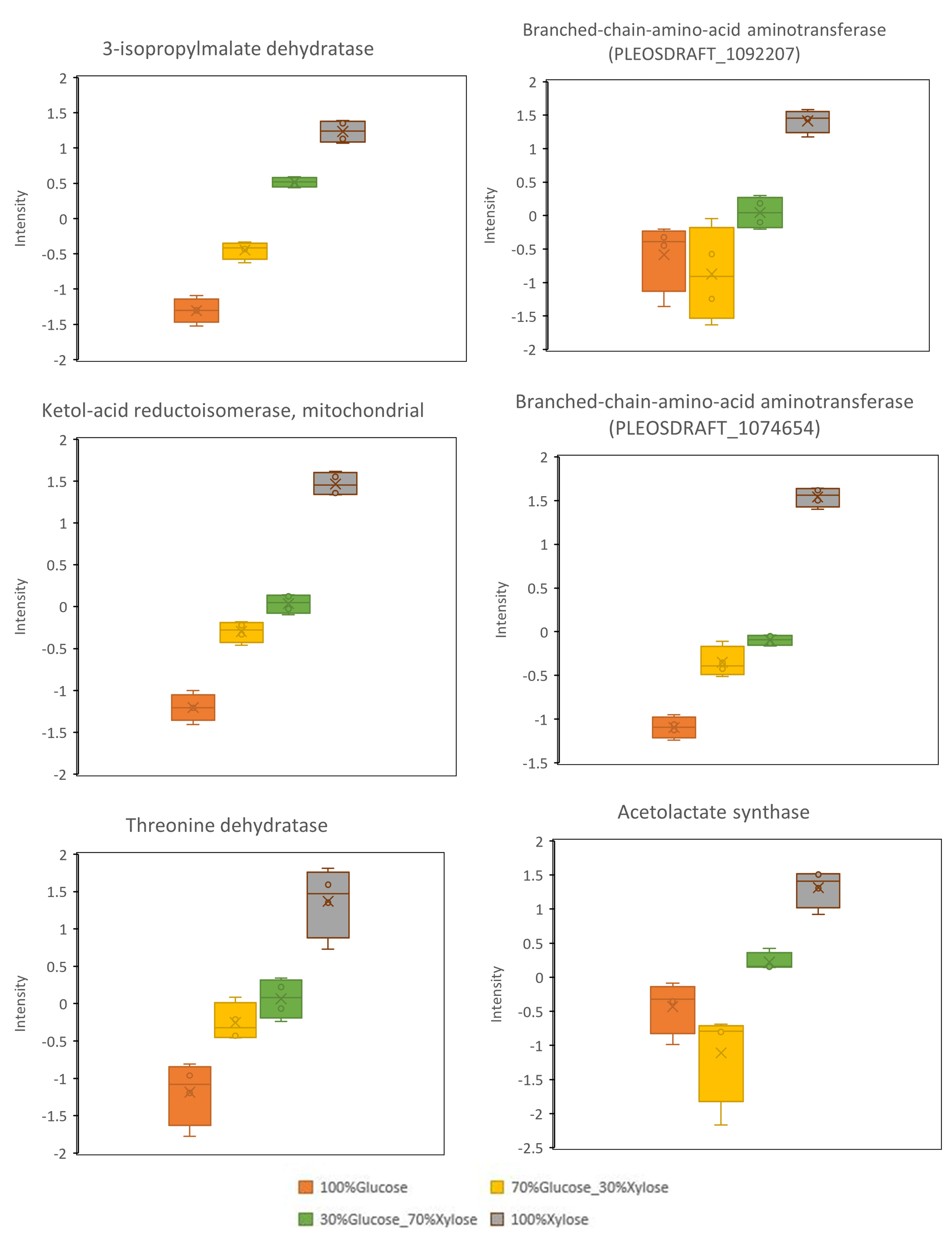P. ostreatus LGAM 1123 submerged cultivation. For this reason, a proteomic analysis of the strain submerged cultivated cells in glucose, xylose, and combinations of them was conducted at the exponential phase. Moreover, intracellular polysaccharides, proteins, lipids and extracellular polysaccharides that are produced from the cells were estimated. Using Gene ontology analysis, the proteins were classified into different metabolic processes and pathways. The proteins were classified into lipid, carbohydrate and amino acid biosynthesis-related proteins using the Volcano plot analysis. The upregulated fungi genes related to amino acid biosynthesis were inserted in the STRING Database to reveal the most upregulated metabolic pathways, through Kyoto Encyclopedia of Genes and Genomes (KEGG) database. The respective enzymes were analyzed to see the expression in each tested conditions.