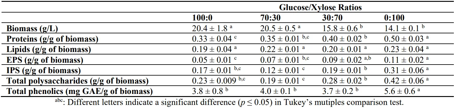 13]. The strain was found to be capable of growing and producing high-value biomass with a rich amino acid profile in a mixture of glucose and xylose and an aspen wood chip hydrolysate composed mostly of glucose and partially of xylose [