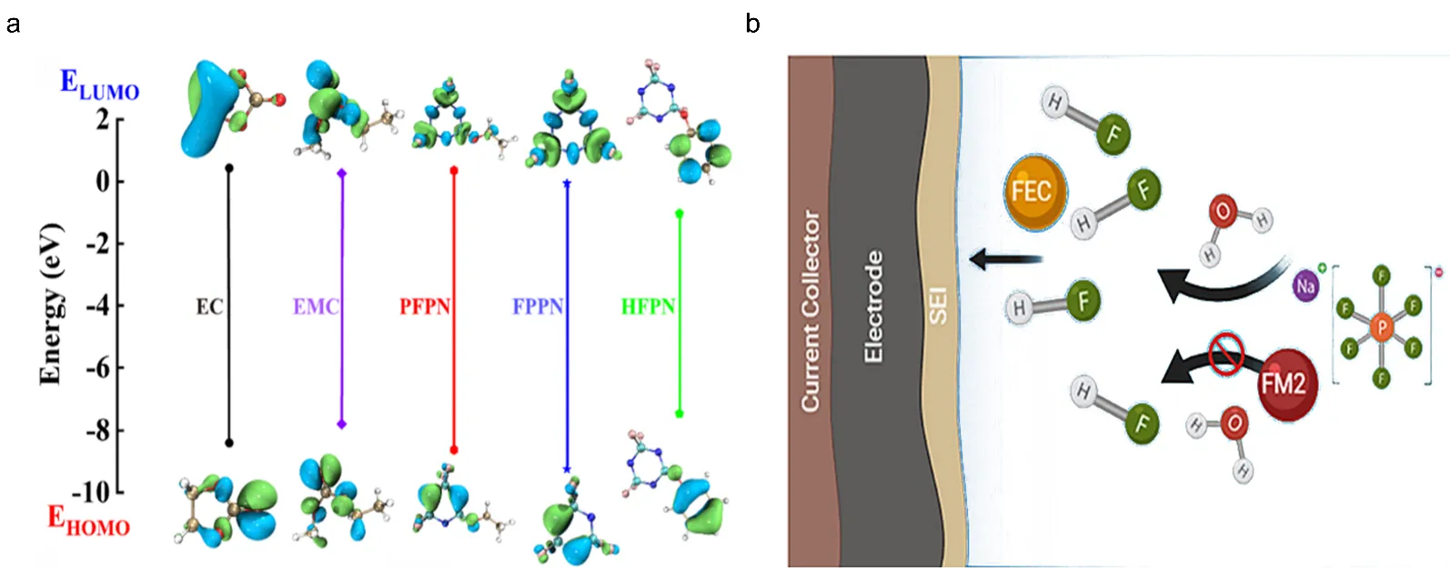 a) The HOMO and LUMO energy levels of EC, EMC, PFPN, FPPN, and HFPN. Reproduced with permission of Ref [