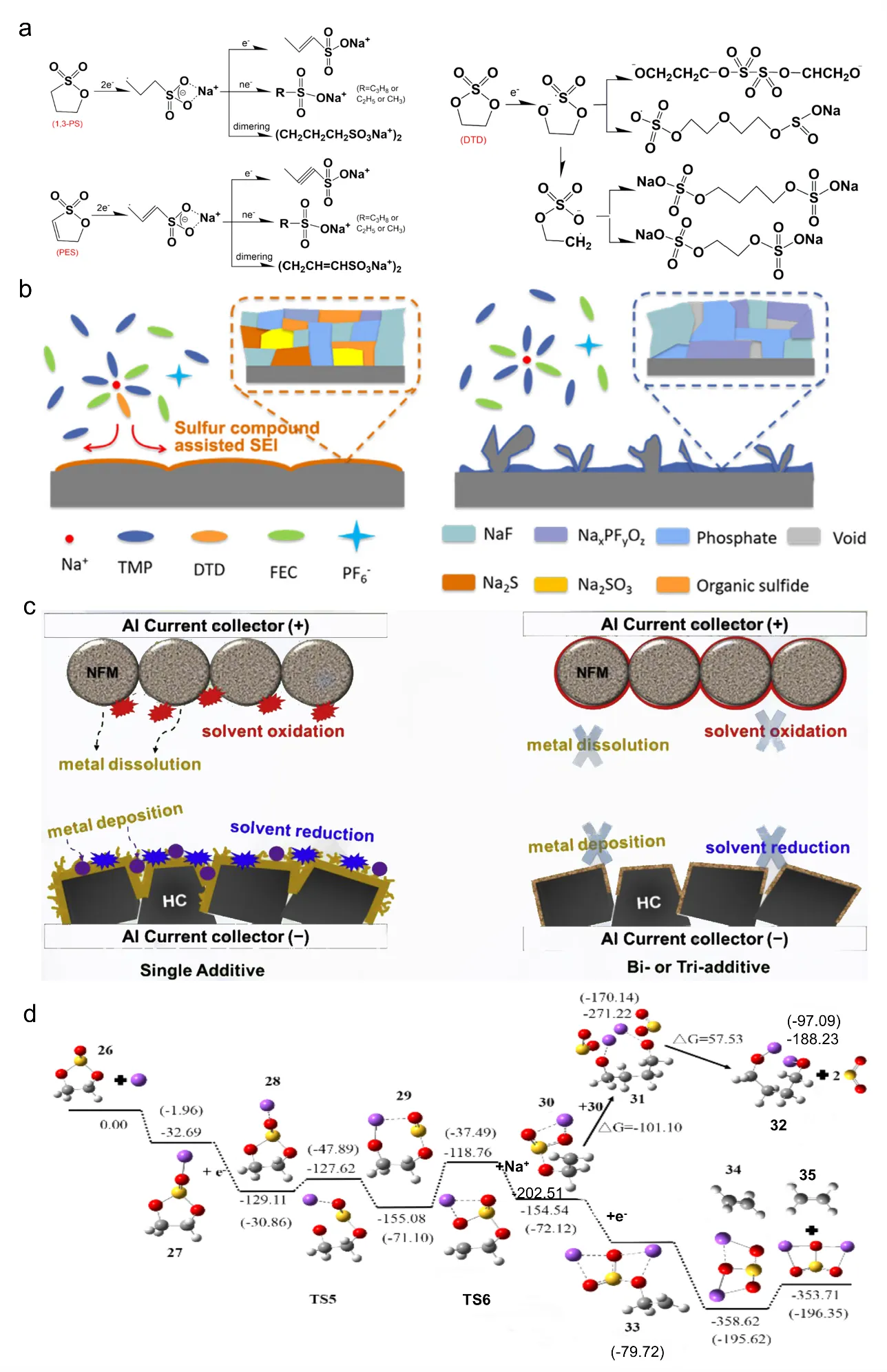 9]. Electrolyte additives exhibit both similarities and differences in their applications in lithium-ion batteries and sodium-ion batteries. 1,3, 2-dioxathiolane-2,2-dioxide (DTD) is typically used as a film-forming additive in LIBs to improve the compatibility of the electrolyte with graphite electrodes [