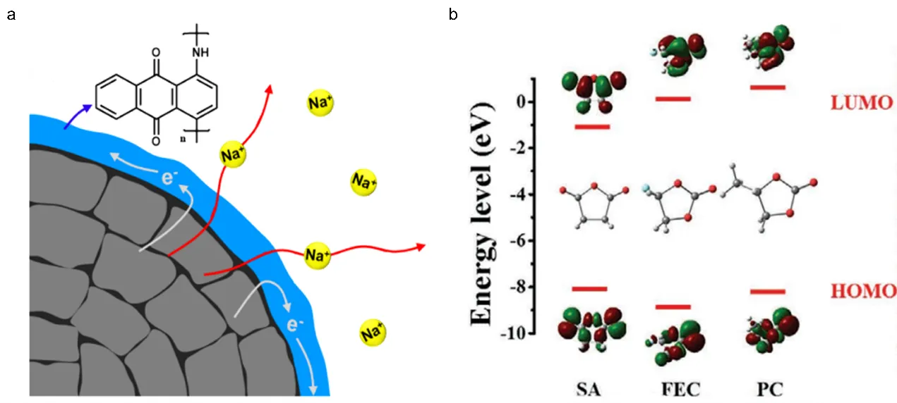 71]. This study represented a pioneering achievement in the in-situ generation of an electronically-conductive polymer on NVPF material for SIBs. To accomplish this, a minute quantity of AAQ was incorporated into a liquid electrolyte as an additive that could undergo electro-polymerization. Undergoing electrochemical oxidation, AAQ underwent an in-situ transformation, forming a poly(1-aminoanthraquinone) (PAAQ) layer on the surface of the NVPF cathode material. The resulting conductive PAAQ layer effectively mitigated interfacial resistance and suppressed the oxidative degradation of the electrolyte during cycling (a). In a novel approach, Fan et al. investigated the use of succinic anhydride (SA) as a filming additive in sodium-ion batteries (b) [