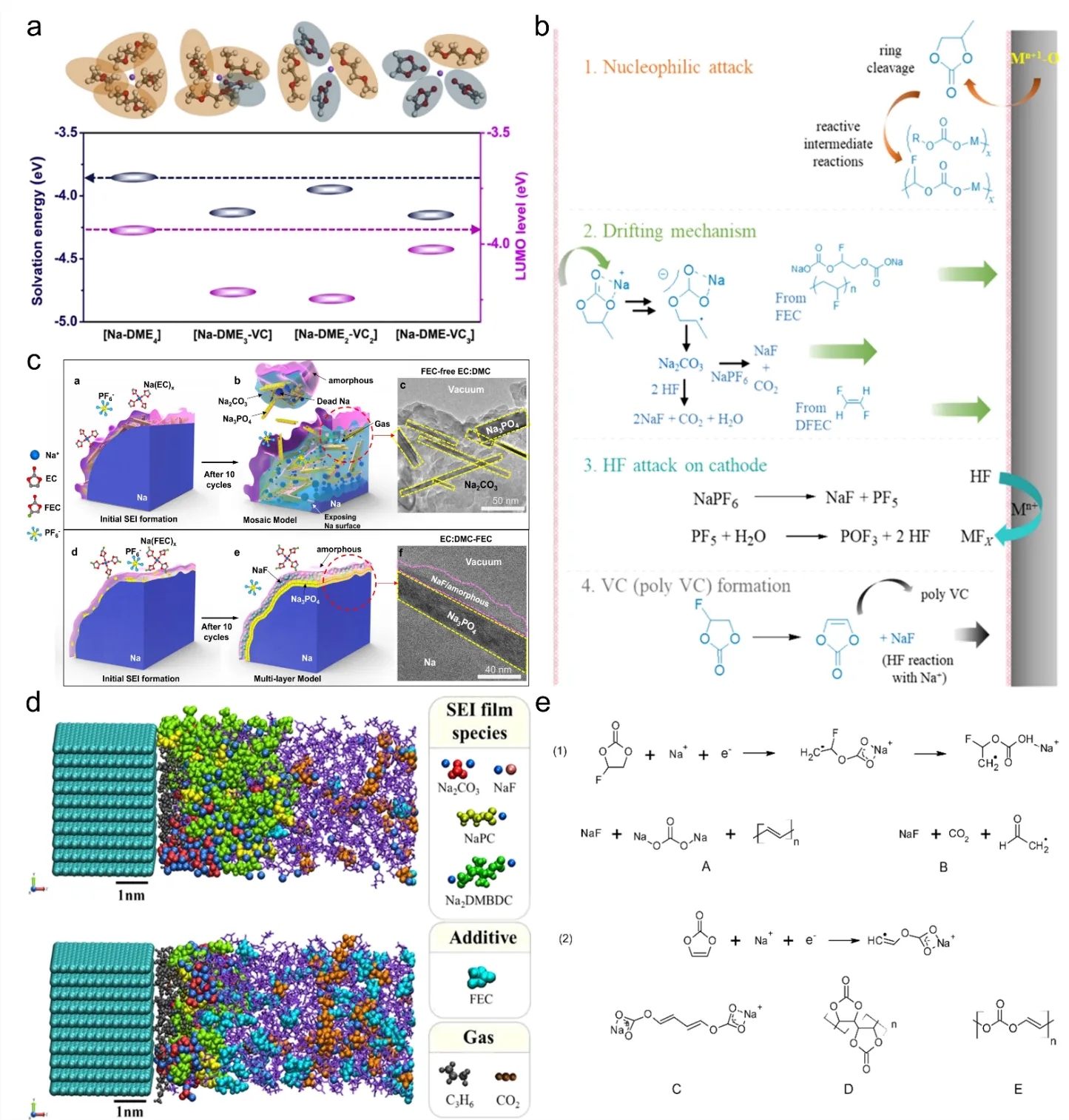 31]. The combination of theoretical calculations and experimental results indicates that the addition of VC to the DME-based electrolyte system can lead to a reduction in the lowest unoccupied molecular orbital (LUMO) energy level of the DME solvation configuration (a), thereby slowing down electrolyte decomposition and maintaining fast Na