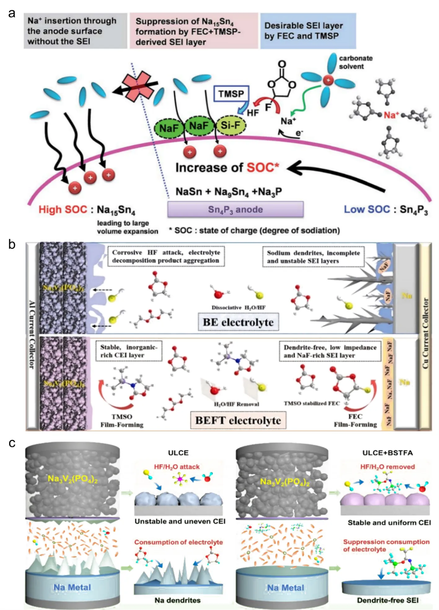 7]. The primary type of electrolyte employed in SIBs is non-aqueous liquid electrolyte, mainly composed of organic solvent, sodium salt and additive. Additives play a crucial role in enhancing the electrochemical performance, safety, conductivity and mechanical properties of batteries. They are widely recognized as one of the simplest, most effective and cost-efficient approaches for practical application [