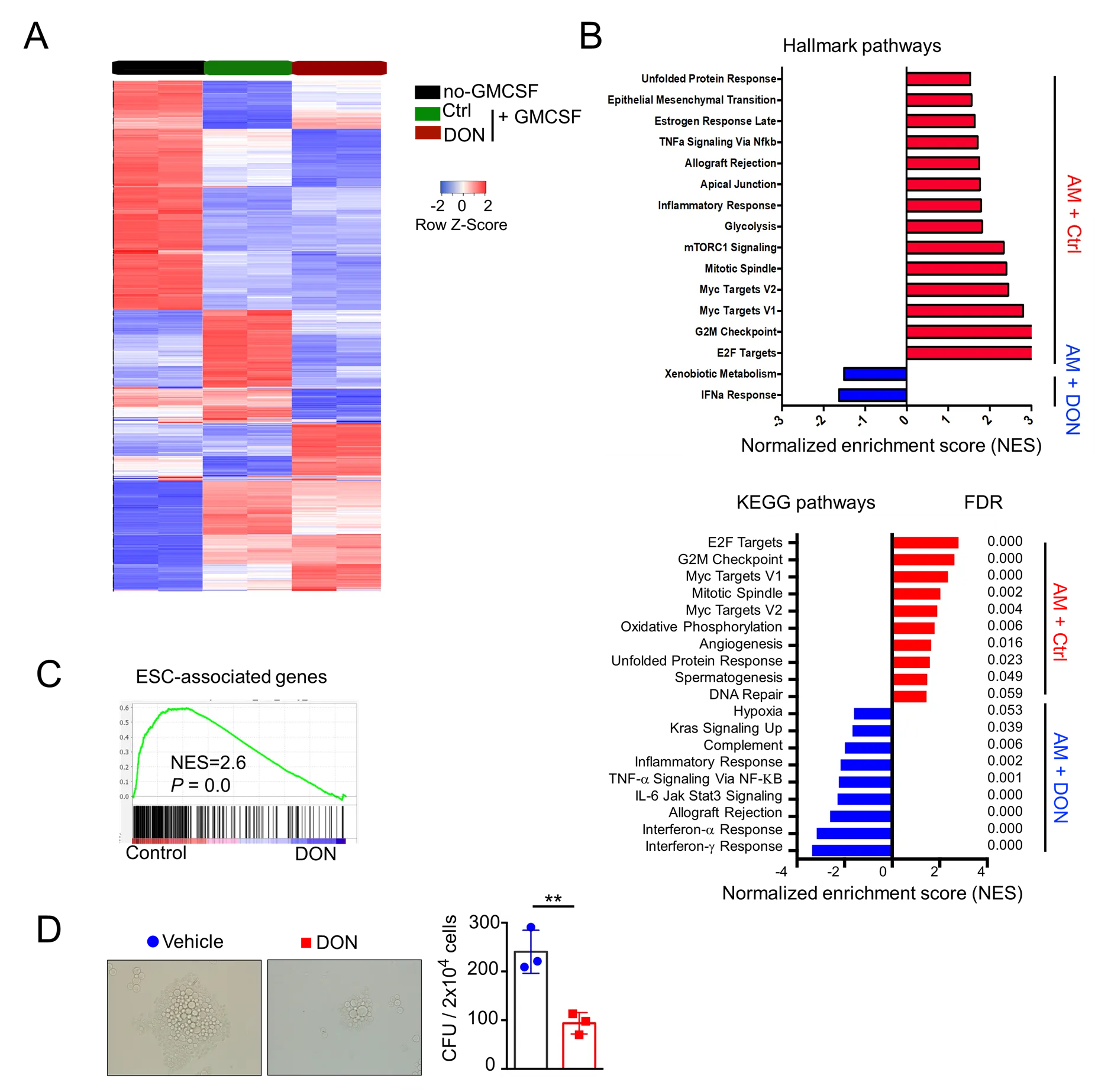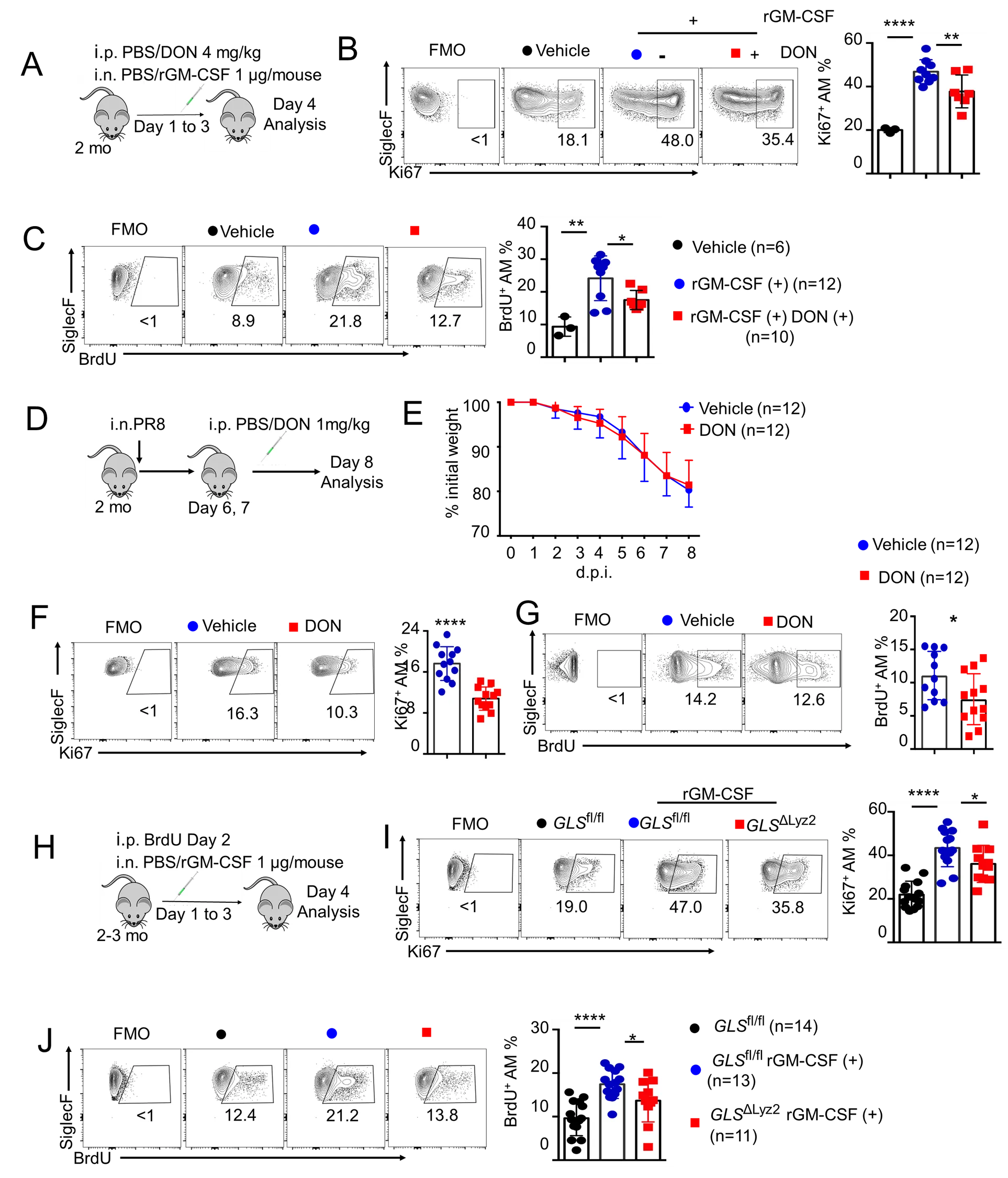 GLSfl/fl as control) were injected with PBS or DON (4 mg/kg) from day 1 to day 3 in GM-CSF stimulation model, and BAL was collected at day 4 for analysis. C57BL/6 WT were injected with PBS or DON (1 mg/kg) at day 6 and day 7 in IAV infection model, and BAL was collected at day 8 for analysis.