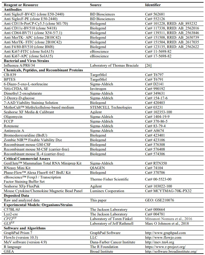 For AM treatment in vitro, AMs were subjected to the treatments with 2-DG (200 μM), DON (4 μM), BPTES (2 μM), CB-839 (1 μM), ETO (10 μM) or vehicle in complete medium overnight in the absence of GM-CSF. Then the cells were washed with warm PBS twice and treated with the above reagents in complete medium with GM-CSF overnight. Cells were then analyzed by Flow cytometry, and RNA-seq.
