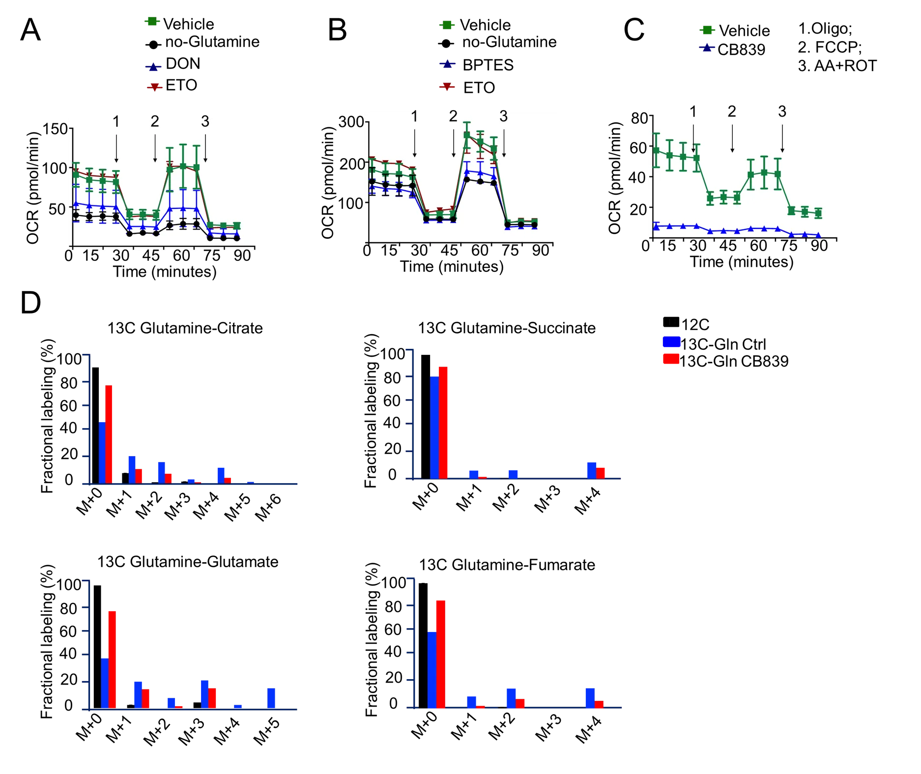 in vitro for on a period of 4 days. Activated cells were incubated with glutamine free RPMI 1640 medium (Life Technologies: 11879020) supplemented with 10% dialyzed FBS (Life Technologies: 26400036), 1% P/S and 0.3 mg/mL [U-13C5] glutamine (Cambridge Isotope Laboratories: CLM-1822-H-0.1) and treated with CB-839 or vehicle. The cells were collected and washed once with PBS, then metabolites were extracted with 80% methanol and dried under a nitrogen stream in a sample concentrator. Dried metabolite samples were dissolved in 75 μL