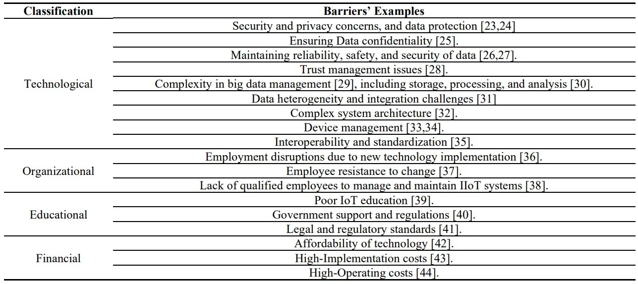 11]. Despite its potential, IIoT adoption confronts significant barriers. Numerous researchers studied the IIoT adoption barriers in different classifications of industries. For example, Desingh et al. reviewed the barriers to IoT adoption within the context of healthcare systems [