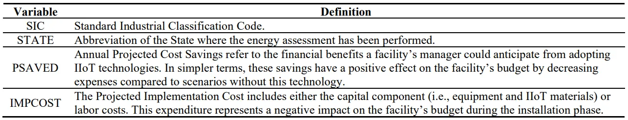 68]. This temporal distinction allows the analysis to concentrate on recent economic trends and practices for IIoT recommendations. The research delves into variables pertinent to IIoT recommendation. Table 2 provides definitions of the variables extracted from the IAC Database.