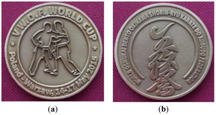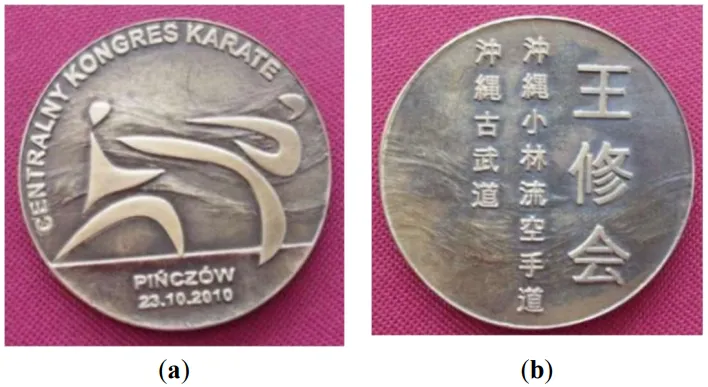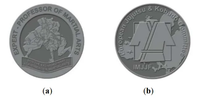 . Medal of EJKC, sponsored by IMJJF [courtesy of IMJJF]. (a) fighting jujutsuka and: “Expert - Professor of Martial Arts”, “For Extraordinary Achievements in Martial Arts”; (b) keikogi and “European Jūjutsu & Kobudō Committee”, “IMJJF” (International Modern Ju-Jitsu Federation).