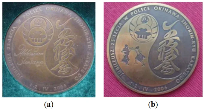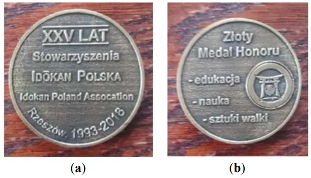To celebrate the 15th anniversary of Idokan Poland Association (IPA) a brass badge was issued, n = 24 pieces. The Medal “20 years of IPA”, or the “Silver Badge of IPA”, was released in a greater number of copies, n = 50, and 36 have been awarded (as of 22 of December 2018). 25th anniversary of IPA was celebrated with “Golden Medal of Honour”—issue of n = 50 pieces. Designed by W.J. Cynarski, it was made by Robert Baran, “Artgraw” company (who also produced medal for 20 years of IPA). However only 6 of these badges have been awarded [; [