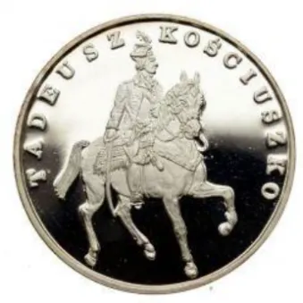 Tadeusz Kościuszko invariably enjoys popularity both in Poland and in the USA, as a hero of both countries and nations. He was depicted in coins issued in times of PRL, and continues to be promoted, e.g. on the silver 100,000 zloties coin (39 mm, Ag 999, 31.1 g, n = 10,000, ). He is riding on horseback with his sabre, unsheathed. In 1994, on the 200th anniversary of Kościuszko Uprising, two coins featuring this hero were issued: cupronickel 20,000 zloties and silver 200,000 zloties [, positions 6–7]. Mounted Hussar and Commander Kościuszko on horseback [] are like St. George on the coin 3 roubles, 2010 (Ag 999, 39 mm, 31.5 g, volume of issuance n = 5000) []. St. George, archetypal noble warrior, kills the dragon, a symbol of evil. By analogy, Polish nobility is ready to fight for higher values.