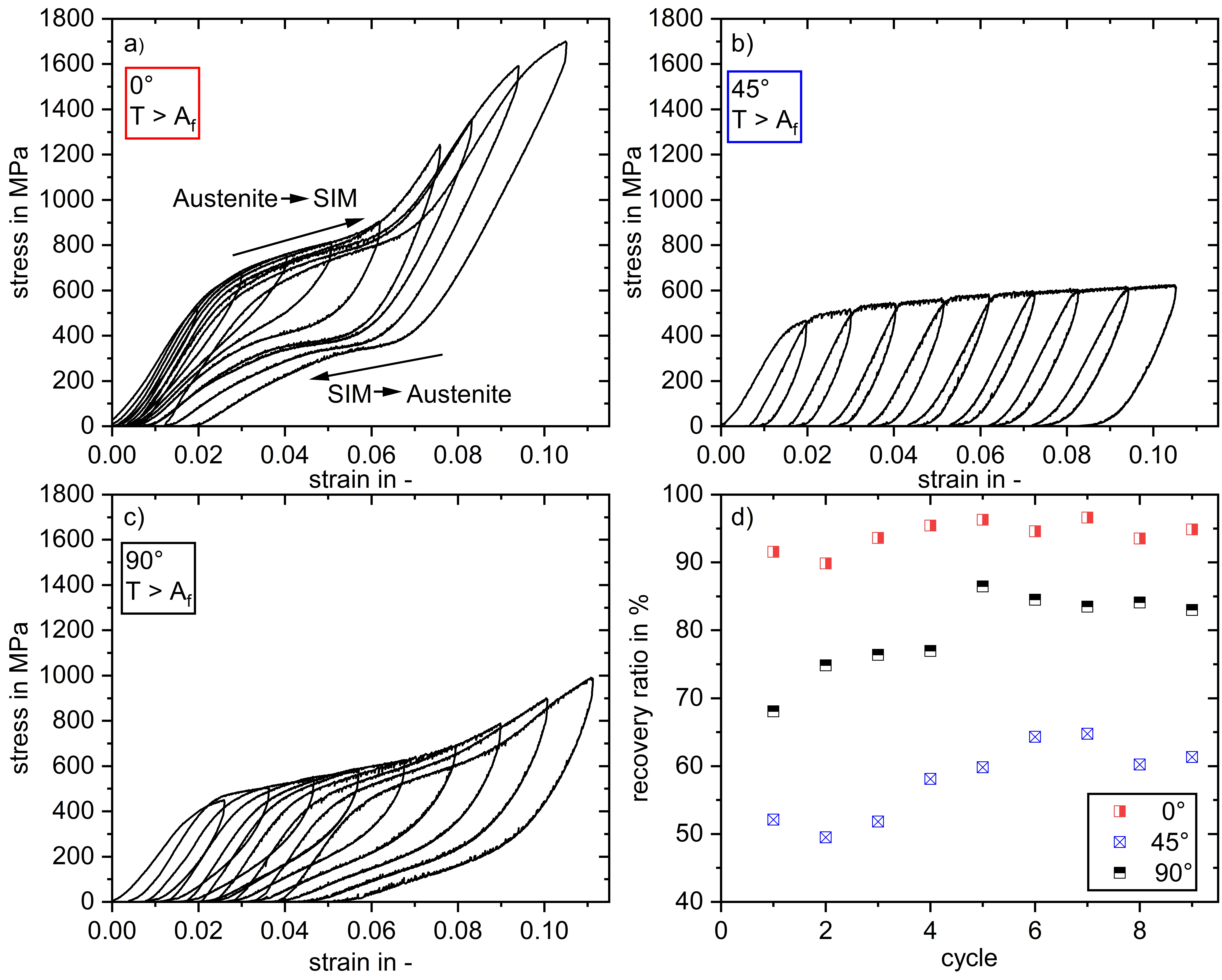 Af), which can be seen in b) for the first three cycles. Again, the sample was loaded until the desired pre-strain of 2% was reached. Every cycle, this pre-strain was elevated by 1%, ending at 10% after a total of 9 cycles. After attaining the pre-strain, the sample was unloaded down to 25 MPa. To compare the shape memory effect and the superelastic effect, the recovery ratio