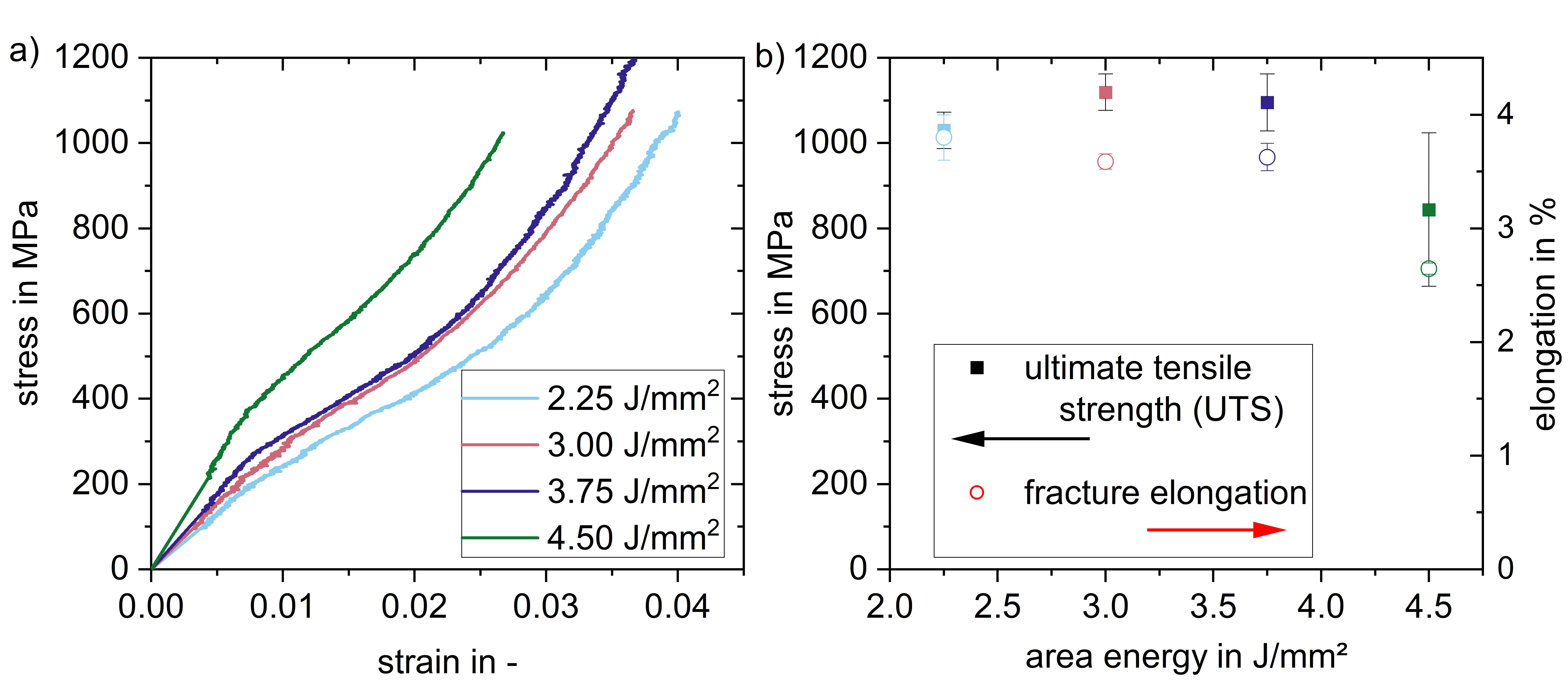 −1. For each chosen energy input four tensile specimens were built and individually tested. The average ultimate tensile strength (UTS) and fracture elongation with a standard deviation is calculated from the experiments.