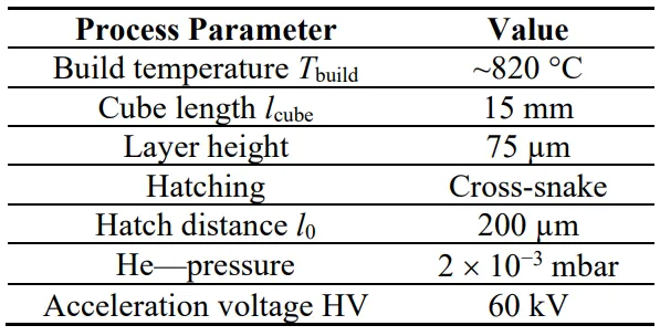 18]. lists the fixed PBF-EB process parameters for the generation of the NiTi process window study. lcube denotes the edge length of the produced NiTi cubes. The lateral velocity (