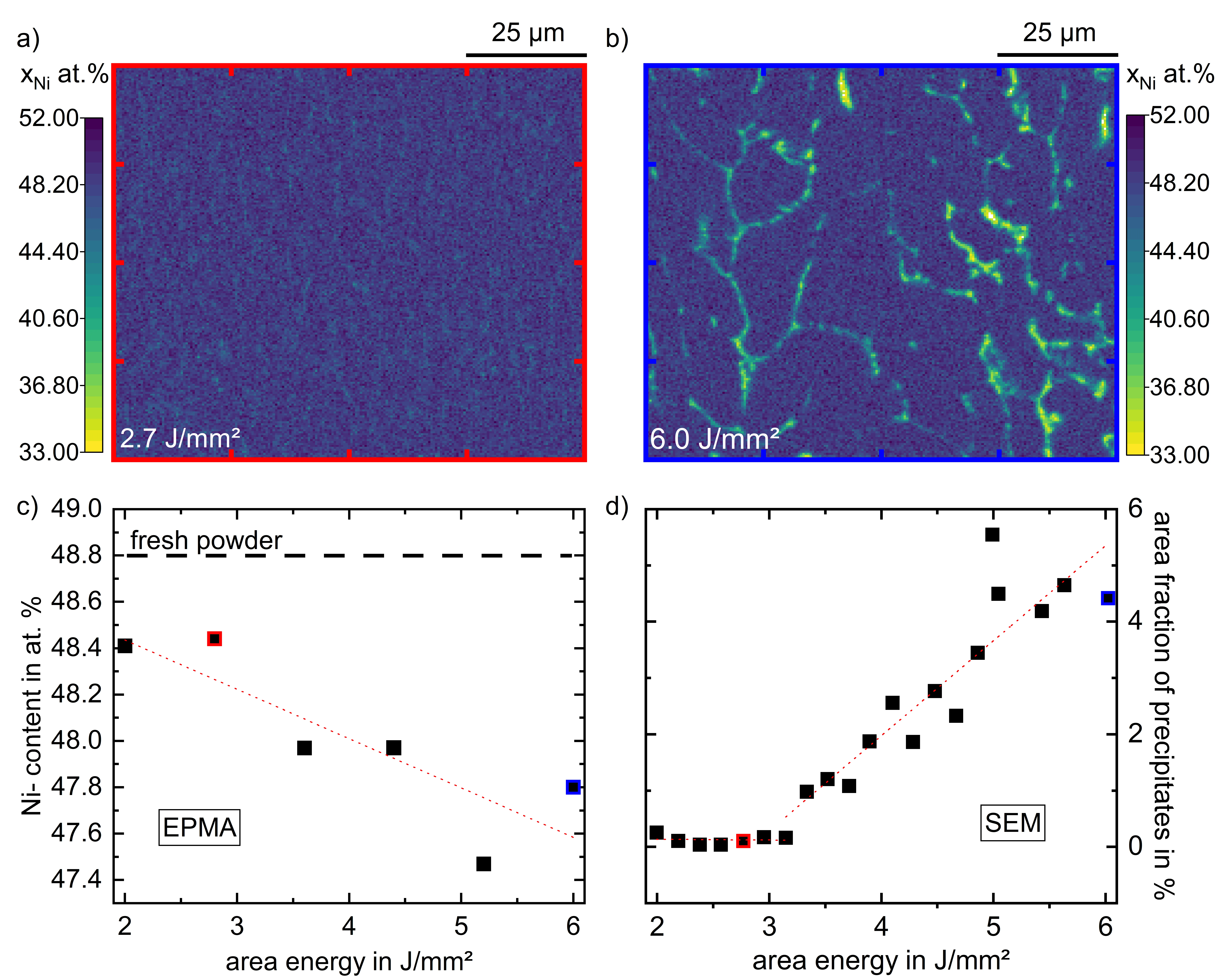 Af displays the temperature at which all martensite transformed to austenite. However, the controllable Ni-loss via the energy input can be used as a tool to manipulate the microstructure in order to tailor the mechanical properties. A similar technique has been applied to a TiAl alloy before [