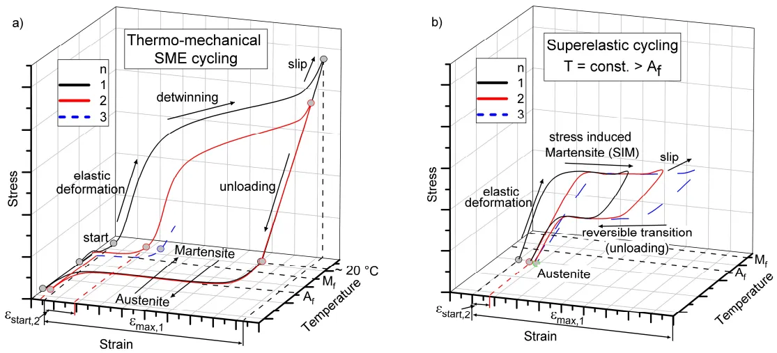 εmax,n represents the recovery rate of each cycle. represents the previous explained experimental procedure on the Gleeble 3500 for the SME cycling (a) and the SE cycling (b). The focus in the results section is set towards the stress-strain response and the temperature axis is for the sake of simplicity not plotted.