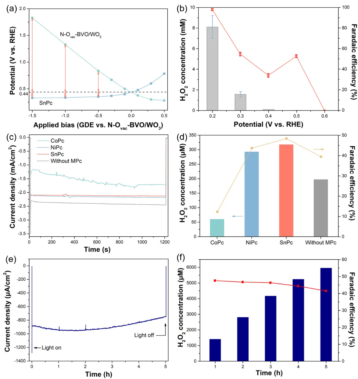 2 through a tandem electrode strategy (). Upon irradiation of the BVO photoanode with visible light, the excitation of hole-electron pairs initiated the OER by generating holes. The generated electrons were directed towards the SnPc-GDE for the reduction of O