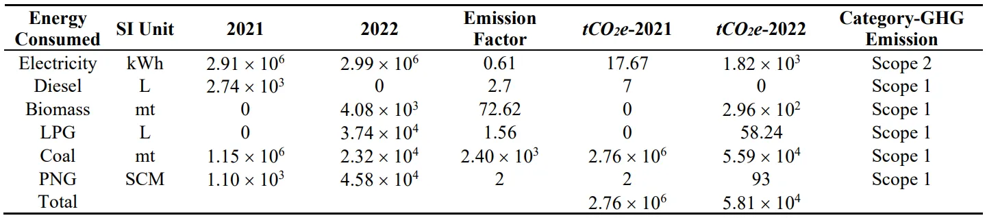 This study evaluated two scopes (scope 1 and scope 2) as defined by GHG for reporting purposes in order to help distinguish between direct and indirect emission sources, enhance transparency, and offer utility for various types of organizations, as well as various types of climate policies and business goals. As per the greenhouse gas protocol and guidelines of India’s GHG program, the direct GHG emissions released from sources owned or controlled by the company are categorized as scope 1.