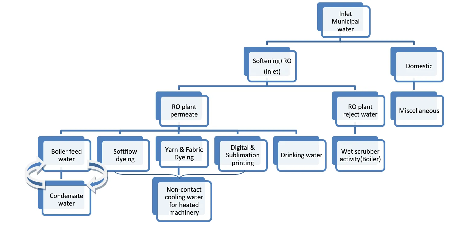 22]. The incoming water supplied by municipal bodies is circulated across the mill for textile wet-processing stages like scouring, dyeing, printing, and finishing. Recirculation and reuse account for this major reduction in water consumption. Processing operations like bleaching full white and dyeing pale shades on wool require optimum bath pH, low water hardness, and total dissolved solids (TDS).