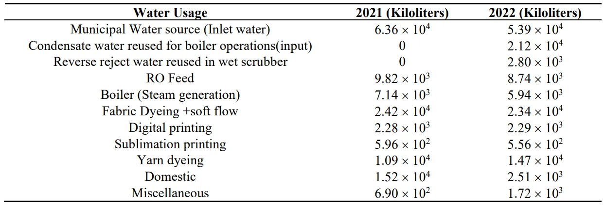 Wet processing machinery used for calendaring and dyeing using a high-temperature high-pressure (HTHP) machine requires subsequent cooling. Water circulated for such non-contact cooling is stored and reused. As indicated in , the annual consumption of water in the facility was reduced by around 15%. This transition is evident because of strategies like reuse and recirculation, which were not implemented in 2021. Among all wet processes, fabric dyeing consumes the highest volumes of water compared to yarn dyeing. The material-to-liquid ratio in the soft-slow type machine is higher as compared to the HTHP package dyeing machine used for yarn dyeing.