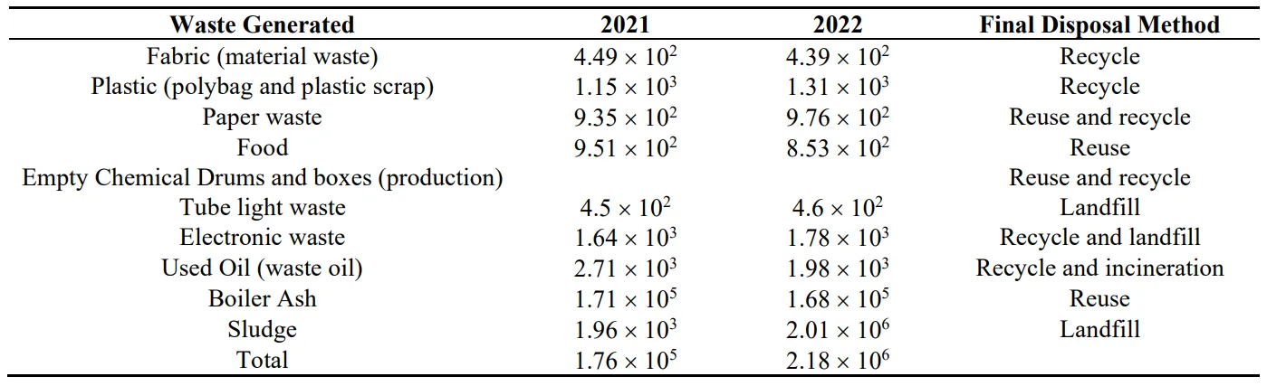 Wool process waste is generated from wet process activities like scouring, chlorination, dyeing, and finishing. Paper waste is generated from printing stationery material has been used for recipe cards and shade cards. Plastic waste is generated from packaging activities, including raw material packaging waste, and finished product packaging activity waste. Food waste is generated from canteen and pantry activities. Tube light and electronic waste generated from operation activities like lighting purposes. Electronic waste like computer parts—keyboards, cable wiring, and others. The average waste generation is 14.8 kg from cotton wet processing [