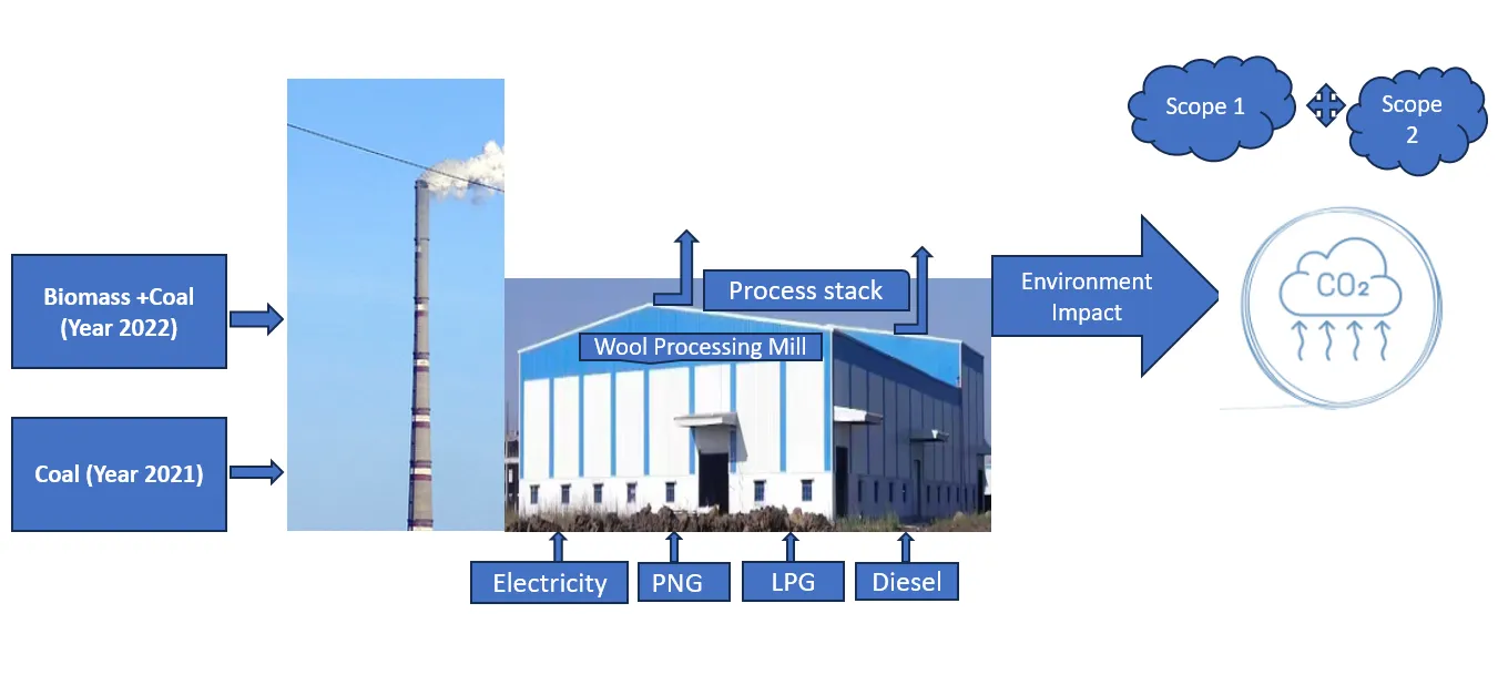 represents the vertical setup of the wool processing mill investigated for this study. As shown in the figure, the input fuel sources like electricity, PNG, LPG and Diesel were used for processing operations. The mill was observed to be majorly dependent on coal to fuel its boiler machinery in 2021. However, the mill phased out coal partially in 2022 as biomass replaced coal. The net impact on climate through scope 1 and 2 emissions is assessed. It is well known that climate change is associated with emissions released from anthropogenic activities. For this study, the carbon emissions resulting from the energy consumption of each fuel source utilized in the wet processing of wool were calculated using a greenhouse gas equivalencies calculator [