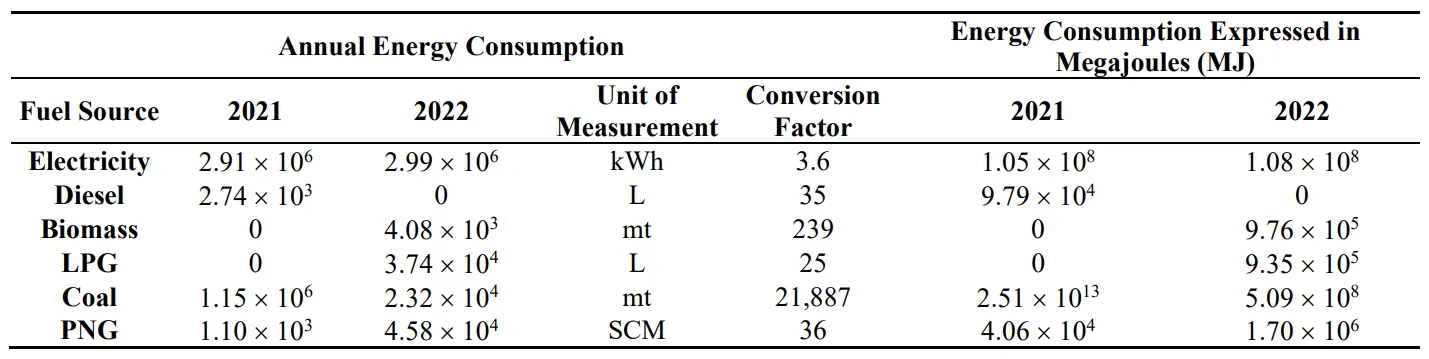 Up till 2021, the mill was using coal, electricity, diesel and PNG. In 2022, the wool processing mill phased out diesel completely and replaced it with PNG. Also, coal was partially substituted by biomass in 2022. During the survey, it was recorded that coal was in use from 1 January 2022 to 30 August 2022. In an attempt to reduce usage of coal, the use of Biomass was seen from 1st September 2022 to December 2022. Record of individual energy consumption from independent fuel sources were expressed in single uniform unit- Megajoules (MJ) for simplicity in calculations using conversion factors specified by Bureau of Energy Emissions (BEE) [