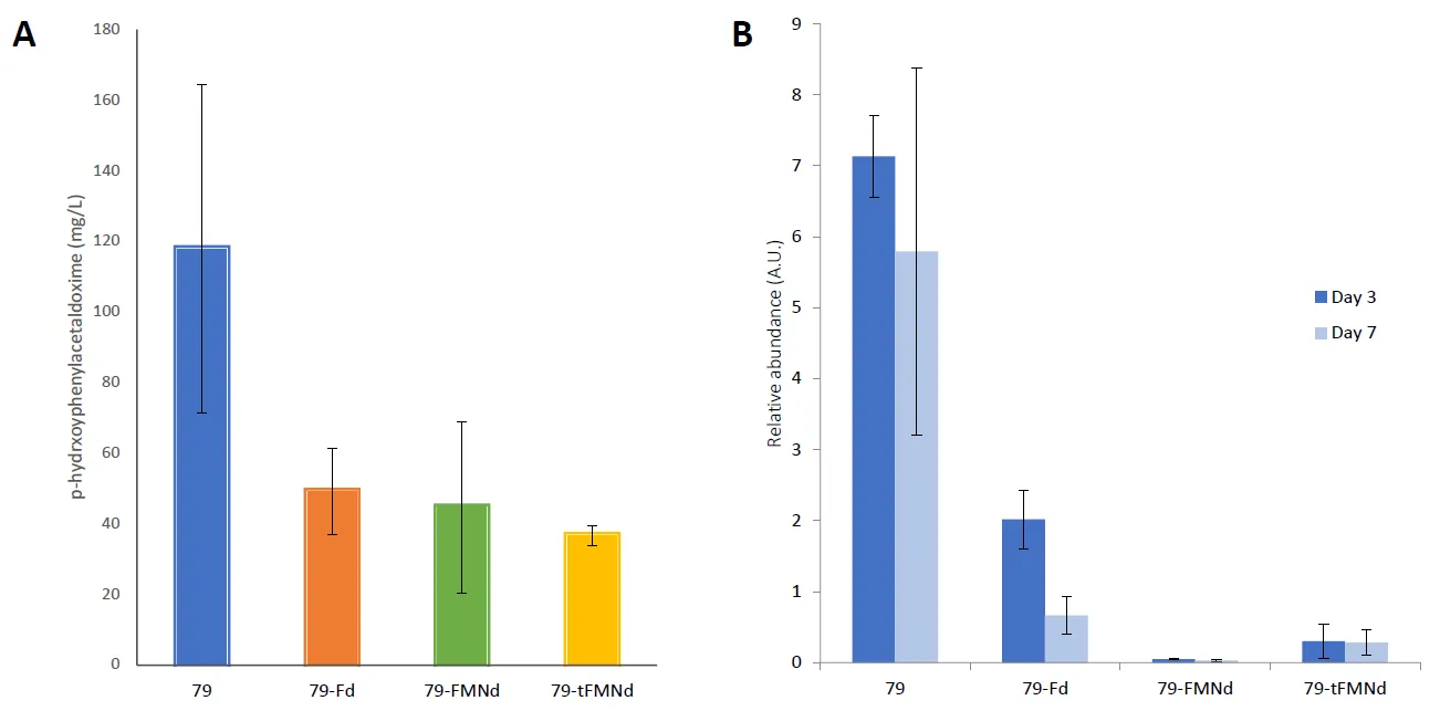 59–265 fusion improves the light-driven P450 activity of CYP79A1 also in cyanobacteria, but endogenous proteolytic activity may challenge fusion enzyme stability, thus limiting overall yield.