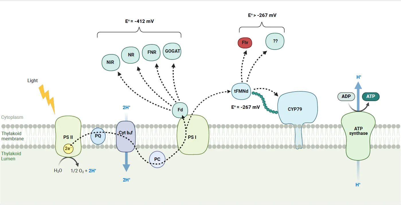 + reductase (FNR), which is responsible for the generation of NADPH, and nitrate assimilation, which accounts for around 80% and 16–21% of the total reducing power generated by photosynthetic apparatus, respectively [