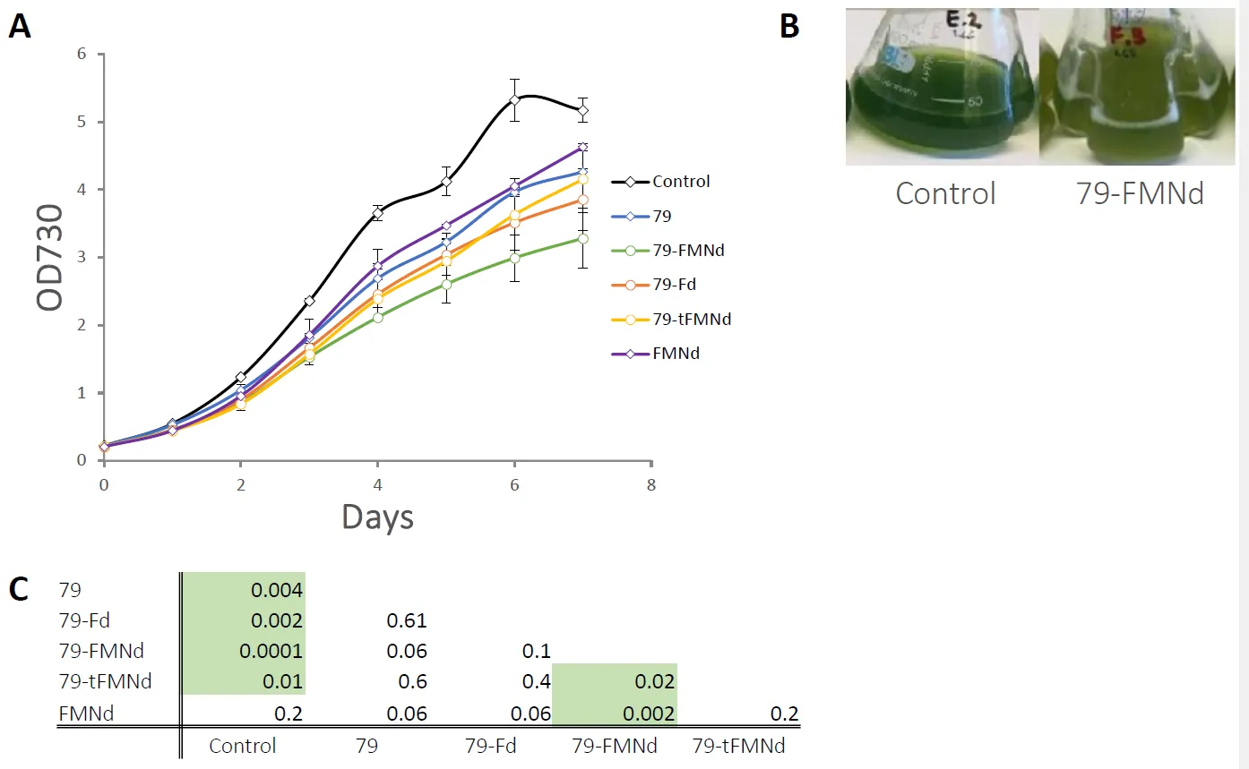 Growth curves were carried out in a Multi Cultivator MC 1000-OD (Photon System Instruments; Drásov, Czech Republic). Initially, 20 mL cultures were inoculated from plates and grown in liquid cultures as described above. These were then used to inoculate fresh cultures to an OD730 of ∼0.2 in 80 mL culture vessels using BGH11 as the growth medium supplemented with 50 µg/mL spectinomycin. Expression of the fusion enzymes was induced on day two with 1 mM IPTG. Cultures were continuously bubbled with humidified air supplemented with 3% (