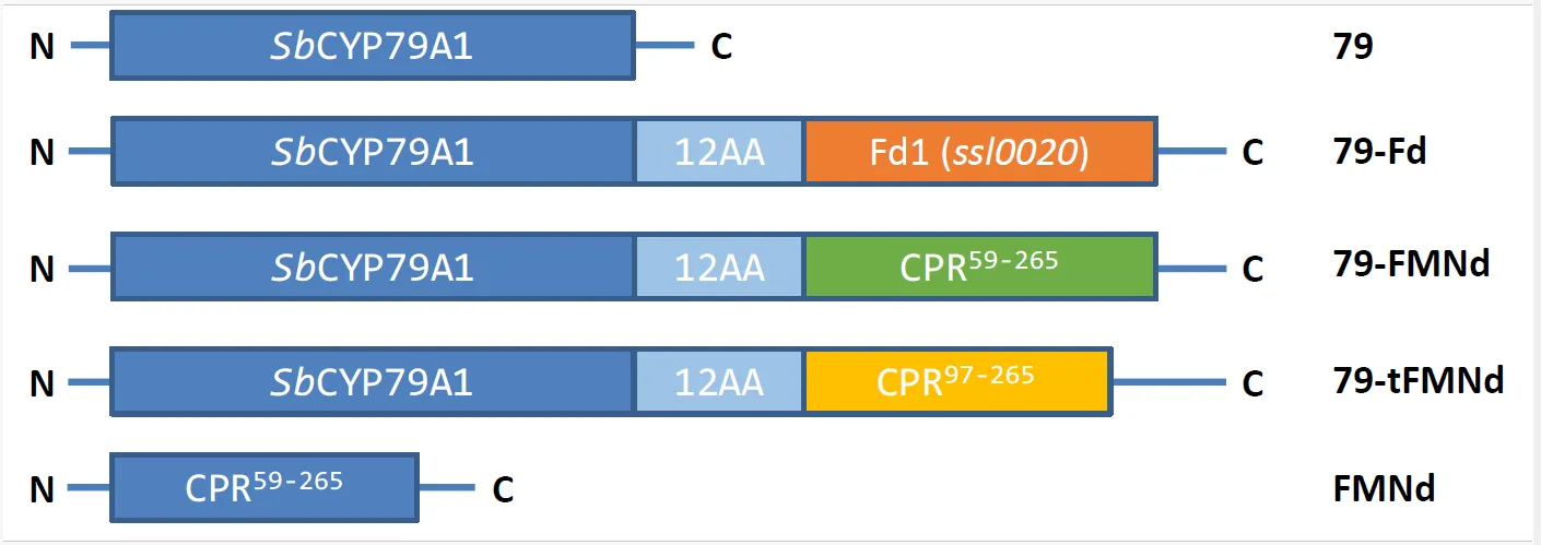Constructs were subcloned into pUC57 by restriction digest and ligation. Before ligation, backbones were dephosphorylated using Antarctic phosphatase (New England BioLabs; Ipswich, MA, USA). SbCYP79A1 and the FMN binding domain of the