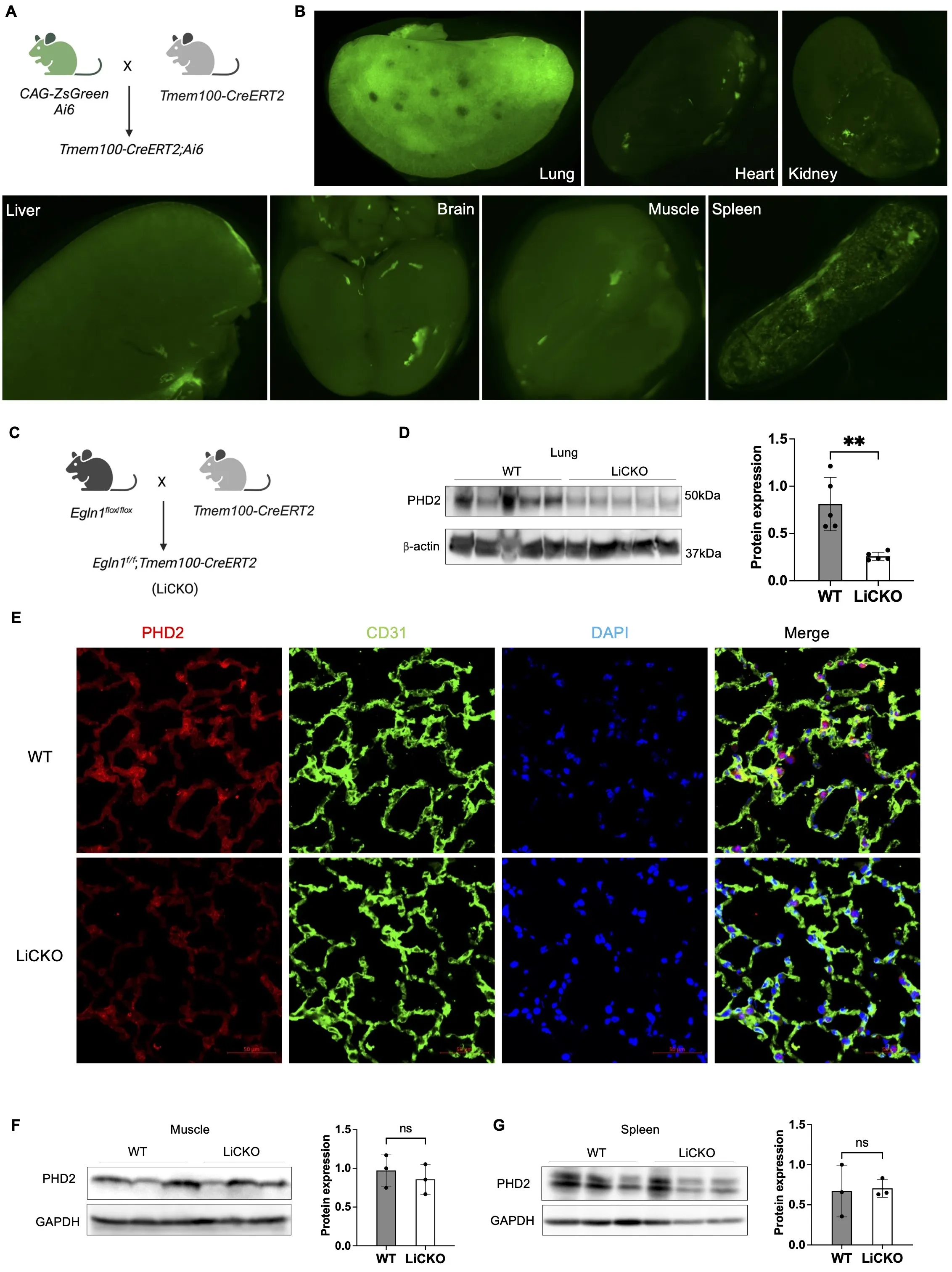 . Lung endothelial-specific deletion of PHD2 in mice. (<b>A</b>) A diagram illustrating the strategy for generating lung endothelial-specific CreERT2 mice. (<b>B</b>) Whole organ imaging demonstrating the selective labeling of the lung by Tmem100-CreERT2 mice at the adult stage. ZsGreen indicates the presence of Tmem100 expression in organs. (<b>C</b>) A diagram illustrating the generation of lung endothelial-specific deletion of <i>Egln1</i> PH mouse model (<i>Egln1<sup>f/f</sup>;Tmem100CreERT2,</i> LiCKO). (<b>D</b>) Western blotting showed the knockdown of PHD2 expression in LiCKO lungs compared to WT (<i>Egln1<sup>flox/flox</sup></i>) lungs. (<b>E</b>) Immunostaining showing the knockdown of PHD2 in lung capillary ECs compared to WT lungs. Green signals indicate CD31<sup>+</sup> ECs. Red signals indicate PHD2 expression. (<b>F</b>) Western blotting showed that PHD2 expression was not affected in the skeletal muscle and spleen in LiCKO mice compared to WT mice. Student <i>t</i> test (<b>D</b>,<b>F</b>,<b>G</b>). <sup>∗∗</sup><i>p</i> < 0.01; ns, not significant. Scale bar: 50 μm (<b>E</b>).