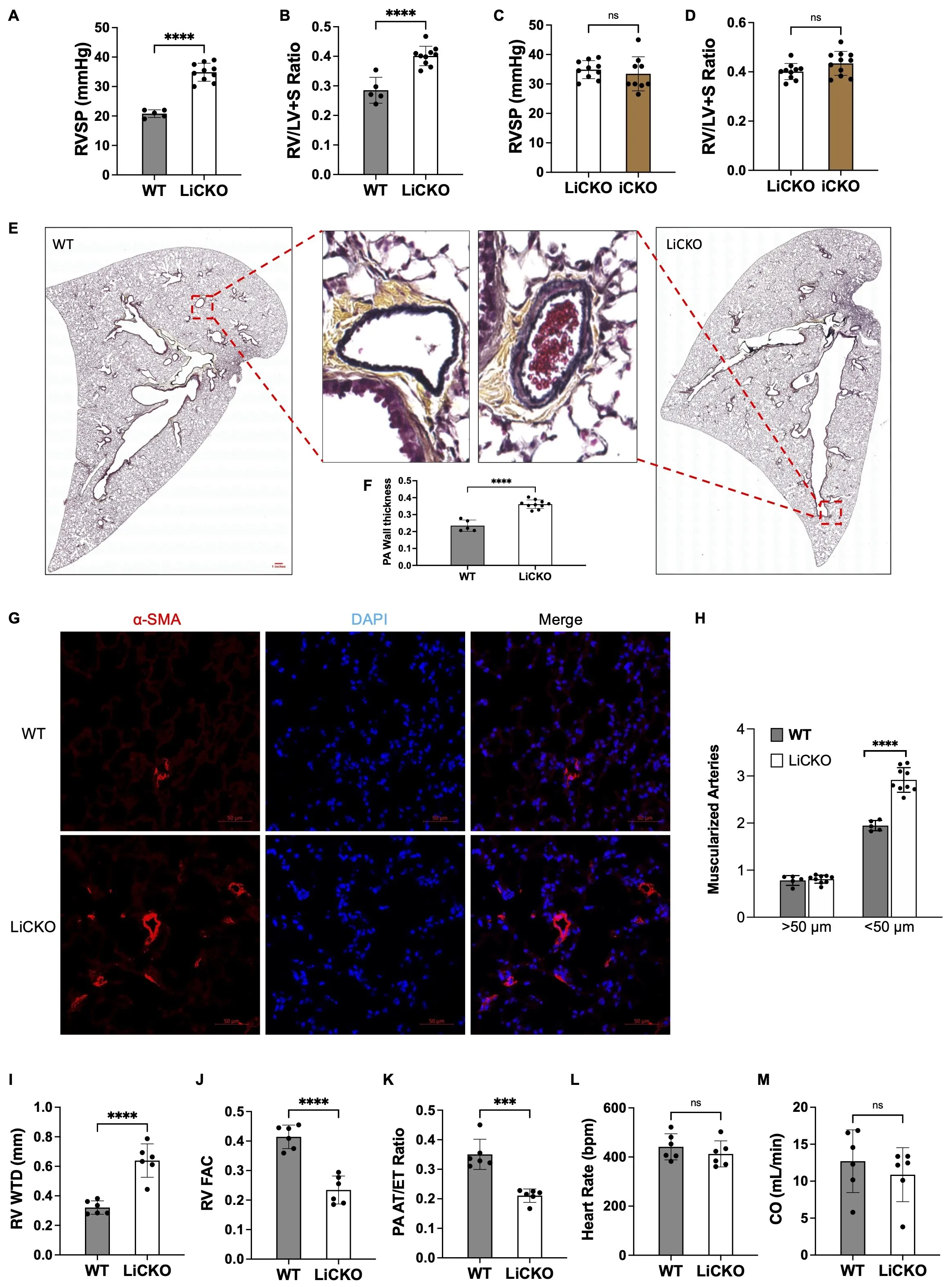 We then characterized the pulmonary vascular remodeling in LiCKO mice by measuring pulmonary wall thickness based on the Pentachrome staining and distal pulmonary arterial muscularization based on α-smooth muscle actin (α-SMA) staining. Our data showed significant increases in pulmonary wall thickness and distal muscularized pulmonary vessels (<50 μm) in LiCKO mice compared to WT mice (E,F). These data suggest that