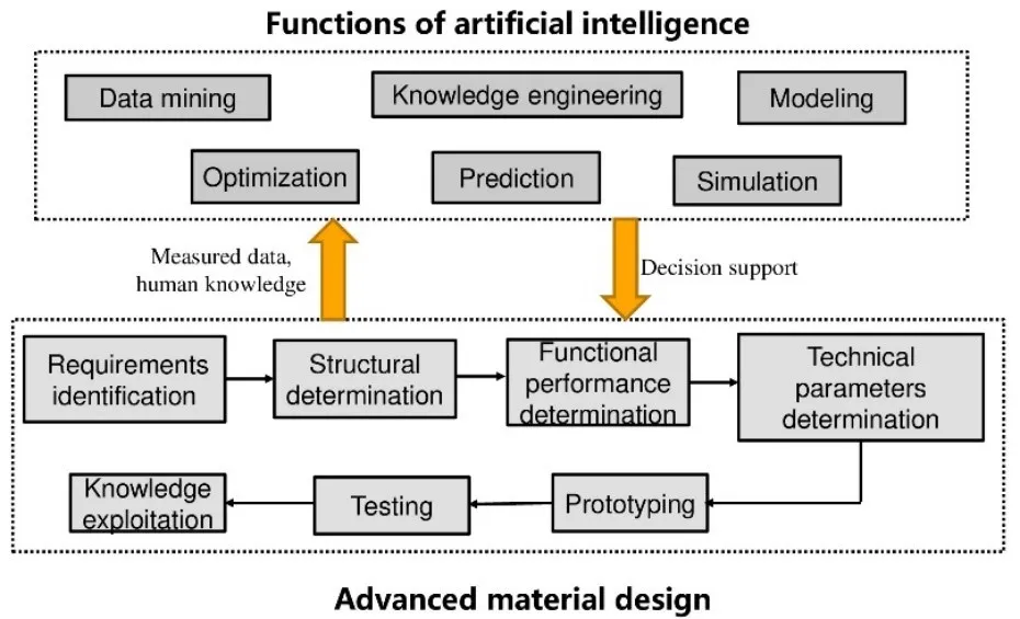 It has been emphasized that the cooperation of AI and industrial simulation in sustainable material design represents a powerful synergy that can significantly enhance the efficiency and transparency of the materials design and development process. In practice, industrial simulations enable the generation of large amounts of data simulating the performance of materials in a digital environment under various conditions, in which designers can easily visualize the performance of materials and their future products. At the same time, AI algorithms can analyze the corresponding simulation results to predict trends and relationships that might not be immediately apparent to provide guidelines to designers for optimizing their design solutions in the real environment. In this context, an AI-based sustainable material/product design process will be created through a series of interactions between the AI functions and the interconnected design operations, i.e., the tools of modelling, data mining, knowledge engineering, optimization, prediction and simulation will be successively applied to the stages of design requirements identification, material structural determination, functional performance determination, technical parameters determination for material implementation, as well as prototyping, testing and new design knowledge exploitation. By using this process, the designers can realize the online monitoring of the material/product life cycle and online optimization of materials according to the decision support provided by the prediction results. The main principle of this AI-based design process is illustrated in .