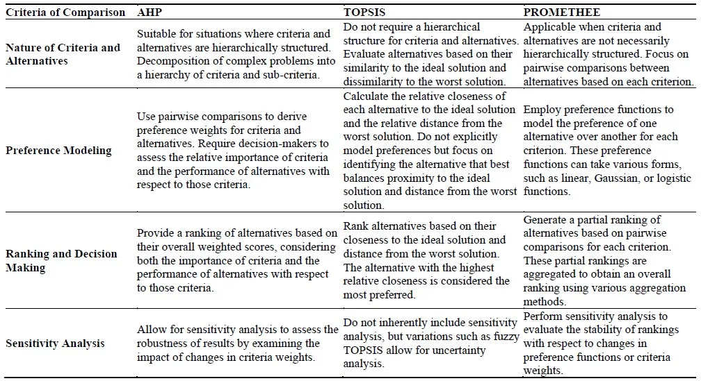 Table 1. Comparison of the three multicriteria evaluation methods.