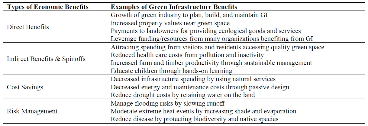 20]. Other benefits have more complicated ties to GI and can be difficult to account for accurately. This is especially true for indirect benefits or economic spinoffs (), which are some of the main ways GI can support economic development [