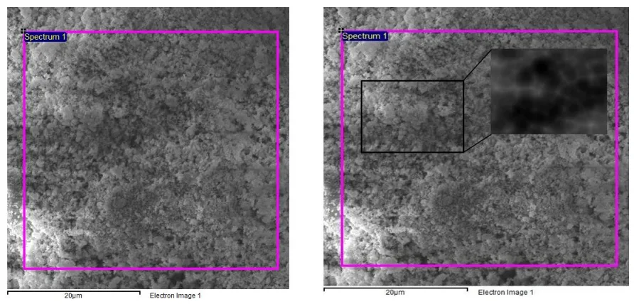 The size and shape of manganese oxide (MnO) nanoparticles extracted from green plants were studied using a scanning electron microscope (SEM). The nanoparticles were examined within a range of 20 micrometers, using an electron beam accelerated to 50 kilovolts. The SEM images, shown in [], revealed the morphology and average size of the nanoparticles. The analysis confirmed successful synthesis of MnO nanoparticles, which had sizes in the nanometer range. The particles appeared randomly arranged and asymmetrical, with closely spaced arrangements. [] showed zoomed-in views of the nanoparticles, indicating an average size of approximately ≥ ± 50–70 nanometers, with clear boundaries visible upon further magnification. However, SEM scans indicated that the produced MnO nanoparticles were dispersed randomly. EDX analysis was employed to examine the formation and chemical composition of manganese oxide (MnO) nanoparticles synthesized from green sources. The presence of elemental manganese (Mn) in the samples was confirmed through EDX analysis, as showed in [], showcasing the EDX pattern and mapping. This verification underscores the effective synthesis of nanoparticles using biological components extracted from