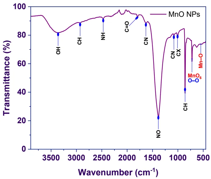 Fourier Transform Infrared (FTIR) spectroscopy is essential for the identification of chemical functional groups and the characterization of intermolecular forces resulting from the interaction between two or more mixtures of different functional groups or compounds. In this study, FTIR analysis was employed, as showed in []. Plants contain a variety of phytochemicals, constituting a rich source of various functional groups. Consequently, FTIR analysis holds promise in predicting the presence of additional functional groups containing heteroatoms, predominantly involving carbon bonded with H, O, N, OH, and X, when compared to manganese oxide synthesized nanoparticles. Through extensive review of the literature [