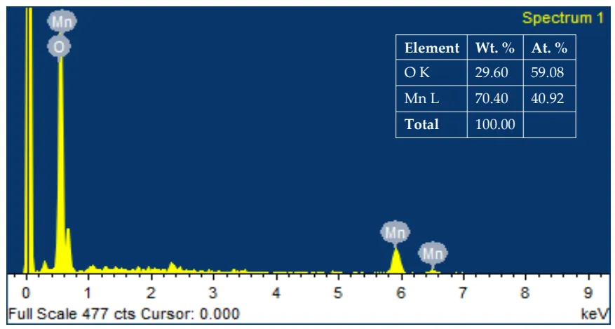 EDX peaks in the spectrum indicated the presence of Mn at lower energy levels (around 1 kilo electron volts, keV) with the highest peak representing MnO, and at higher energy levels (above 5 keV) representing elemental manganese. Furthermore, peaks corresponding to oxygen (O) were observed, confirming the adsorption of biological molecules from the plant extract onto the nanoparticle surfaces. The presence of oxygen confirms the oxide form of the Mn nanoparticles. The absence of impurities and the high concentration of Mn were confirmed by the EDX analysis. Consequently, it can be inferred that the desired nanoparticles were successfully synthesized using plant leaf extract. [] presents the observed atomic percentages for all elements, with Mn accounting for 70.40% and O for 29.60% by weight. The EDX pattern of the green-synthesized MnO nanoparticles was consistent with previously published literature [