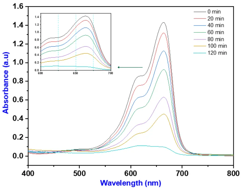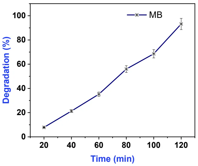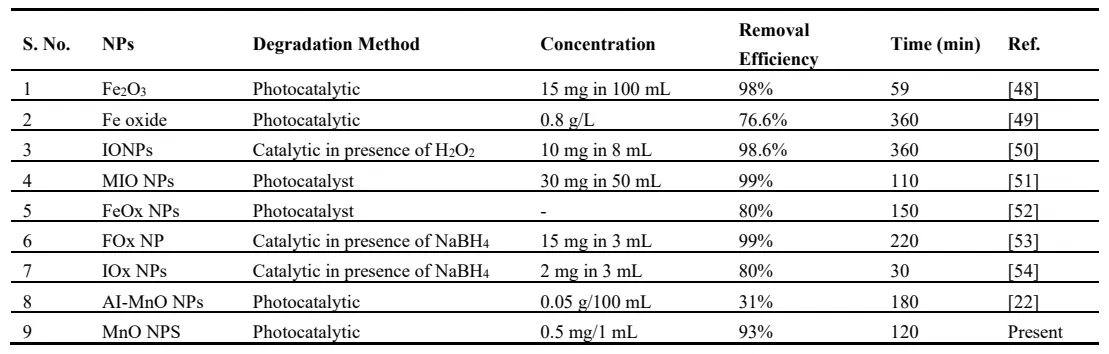The photocatalytic degradation activity of green-synthesized MnO nanoparticles was assessed using methylene blue dye as a model system, adopted from [