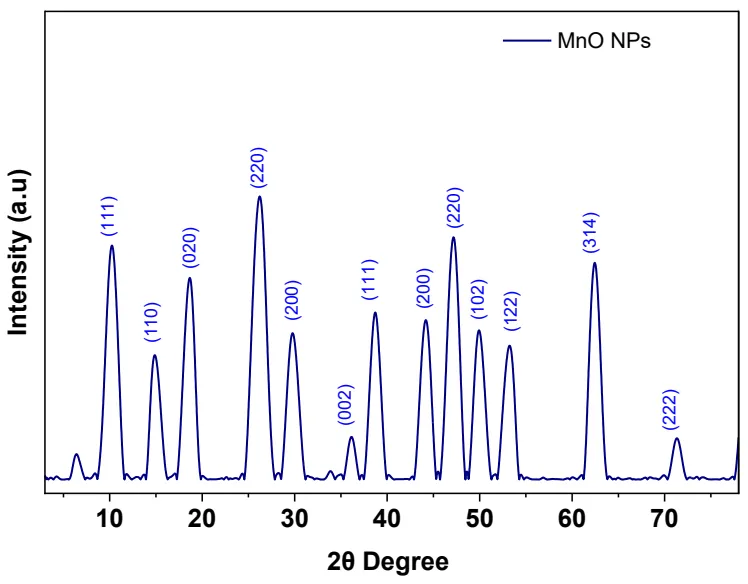 The X-ray diffraction (XRD) pattern depicted in [] illustrates the analysis of manganese oxide (MnO) nanoparticles synthesized through a green method. The XRD pattern closely aligns with existing literature, revealing distinct diffraction peaks at specific angles corresponding to crystal planes. These angles are recorded as follows: (6.4°, 10.24°, 14.88°, 18.66°, 26.22°, 29.22°, 36.14°, 38.72°, 44.18°, 47.18°, 49.92°, 53.24°, 62.44°, and 71.32°). Notably, the peaks of greatest prominence emerge at approximately 10.24°, 18.66°, 26.22°, 47.18°, and 62.44°. These prominent peaks signify the presence of specific crystallographic planes within the MnO
