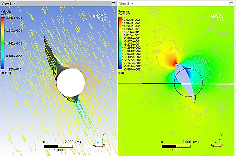 is the contour plot of the velocity magnitude produced by ANSYS software simulating wind turbine blades. The streamline flow, or the direction and speed of the wind blowing across the turbine blade at any particular time, is represented by the colorful lines. The smooth and continuous streamlines in this instance suggest that the flow is laminar, or non-turbulent. To reduce drag and increase lift, rotor blades should be aerodynamically optimized. High lift-to-drag ratio airfoil profiles are frequently employed. Additionally, it’s important to tailor the blade form and twist distribution to the anticipated wind conditions in order to maximize power production. Further, a yaw control system should be installed on the wind turbine to guarantee that the rotor is constantly facing the wind. The flow of the velocity vector is maximized by placing the turbine in the direction of the wind, reducing turbulence, and enhancing overall performance.