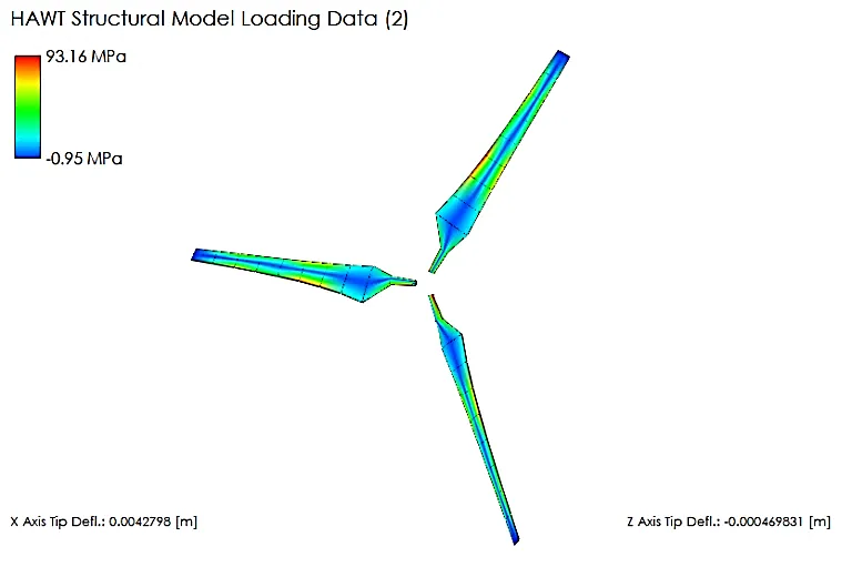 Q-Blade is a highly advanced multi-physics code that covers the complete range of aspects required for the aero-servo-hydro-elastic design, prototyping, simulation, and certification of wind turbines. Q-Blade allows you to run highly detailed simulations of any wind turbine design, with superior physics models more than 20x faster than real-time. All this functionality is made accessible in an intuitive and friendly graphical user interface. shows the structural analysis of horizontal axis wind turbine using Q-blade. Q-Blade helps analyze the structural integrity of wind turbine blades under wind, gravity, and centrifugal loads.