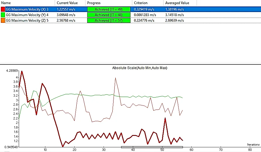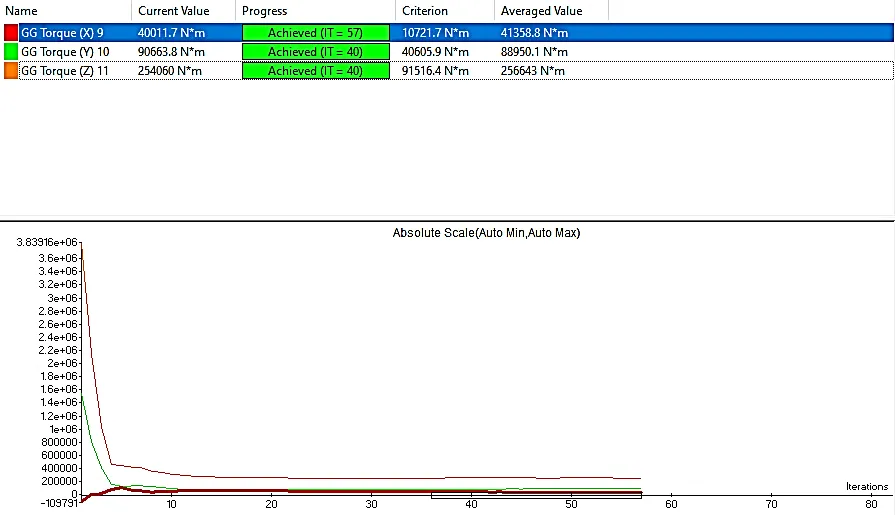 The torque simulation results along the X, Y, and Z directions are displayed in the . Through a number of iterations, it seems to be tracking torque (maybe for convergence). There is an average value and a target value (Criterion) for each direction (X, Y, and Z). The horizontal axis of the turbine rotor is normally aligned with the X-direction. The driving torque, sometimes referred to as the torque along the X-axis, is what causes the turbine rotor to rotate. It is produced by the aerodynamic forces that the wind exerts on the rotor blades. The size of the X-direction torque is affected by variables including wind speed, blade design, and blade angle of attack. The Y-direction is horizontal and perpendicular to the rotor axis. The term “yawing torque” is frequently used to describe the torque in the Y-direction. When the turbine is not exactly aligned with the direction of the wind, the force of the wind acting on the rotor blades causes it. The wind turbine’s yaw system, which modifies the rotor’s orientation, counteracts the yawing torque, which has a tendency to align the turbine with the wind. The Z-direction is vertical and parallel to both the X and Y axis. The tilting or pitching torque is the force acting in the Z-direction. It is caused by the wind’s pressure pushing on the rotor blades, which tends to tilt them upward or downward. A pitch control system typically counteracts the pitching torque by adjusting the angle of attack of the blades to improve performance and prevent undue strain on the turbine construction.