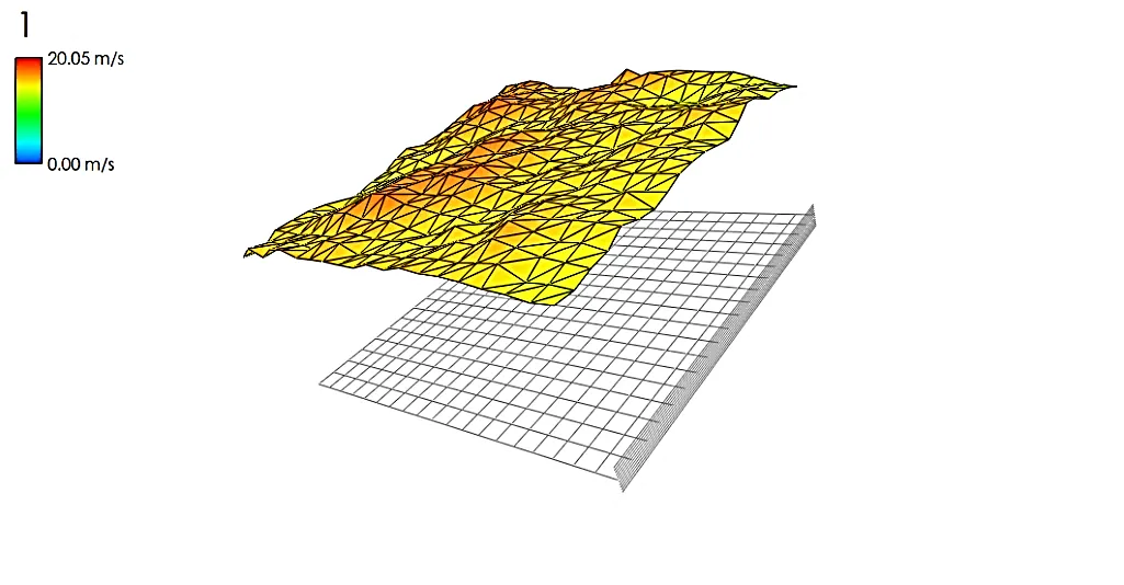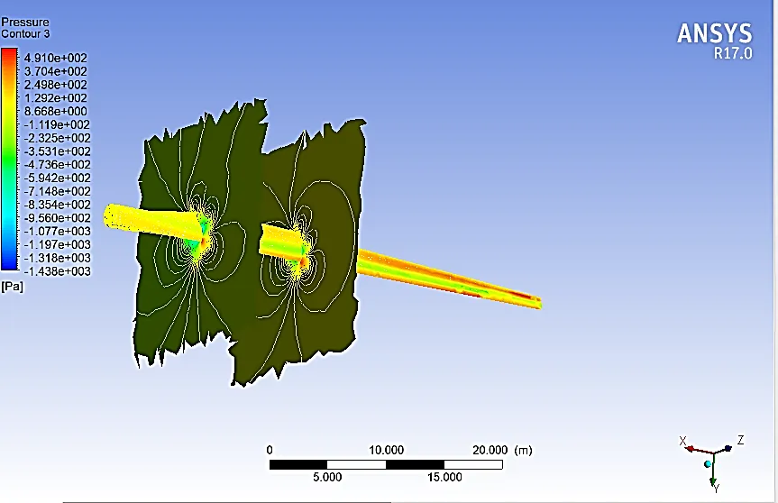 Utilizing computational fluid dynamics (CFD) software, velocity paths in a wind turbine may be simulated. Hence, the fluid flow including the movement of air around a wind turbine is examined in the current research. To perform the flow simulation, a 3D model of the wind turbine’s geometry is created using the CFD program. The wind turbine shape can be discretized into tiny parts or cells using a computational mesh. The mesh resolution needs to be both computationally efficient and fine enough to capture flow details. The inlet and outlet borders for the flow simulation in the boundary conditions section are set. While the flow enters the domain at the inlet boundary, it leaves the domain at the outlet boundary. Determining boundary conditions for the turbine surfaces, such as the no-slip requirement for the rotor blades, may also be necessary. In the next step, a turbulence model is picked that can correctly depict the turbulent behaviour of the flow. The k-model, or Reynolds-averaged Navier-Stokes (RANS) equations are examples of common turbulence models. In the last step, the solver settings are configured, which include the time step size, the convergence criterion, and any other elements unique to the CFD programme. Once it has reached a steady-state or has captured the desired flow behaviour, let the simulation continue. The simulation determines the flow velocity at various points within and outside of the wind turbine. represents the flow simulation to show velocity trajectories.