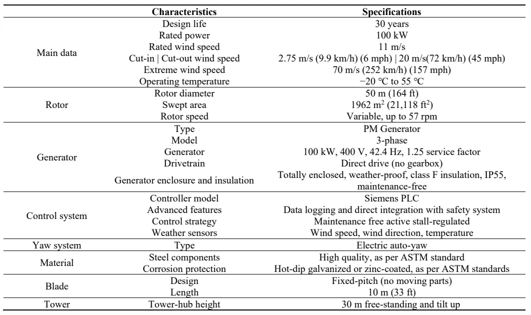 The significant design parameters in the proposed HAWT are blade length, blade pitch, rotor diameter, tower height, generator type, control system and environmental impact. The control system monitors and adjusts the turbine’s operation to optimize power output and protect the turbine from damage due to extreme weather conditions. The location of the turbine, wind speed, turbulence, and other environmental factors all play a role in the design of a HAWT. The maximum operating temperature has been increased to 55 ℃. This enhancement involves several key modifications: using higher temperature-rated components such as a generator with class H insulation and a Siemens PLC designed for higher temperature operation; implementing advanced cooling systems to manage internal temperatures effectively; and selecting materials and coatings that maintain integrity and protect against thermal degradation at elevated temperatures. These improvements ensure the wind turbine’s reliability and performance in hotter climates, thereby enhancing its operational durability and efficiency over its 30-year design life. The turbine must be designed to withstand the expected environmental conditions and operate reliably over a long period. The specification of each design parameter is provided in . If the temperature exceeds the specified range of −20 ℃ to 55 ℃, the wind turbine incorporates several safety and performance mechanisms to manage these conditions and protect its components. An automated control system will shut down the turbine to prevent damage when temperatures surpass safe operational limits. High-precision temperature sensors continuously monitor critical components, triggering preemptive actions like load reduction or shutdown if necessary. Advanced cooling systems help maintain safe operational temperatures during temporary spikes, while materials and design choices, such as class H insulation, ensure durability under extreme conditions. If temperatures exceed 55 ℃, the turbine will halt operation to avoid overheating, and at temperatures below −20 ℃, it may shut down to prevent issues like material brittleness or ice formation. These measures ensure the turbine’s protection and reliable performance across a wide range of environmental conditions.