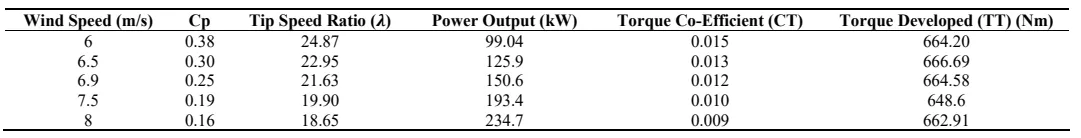 . Operational performance data of the wind turbine for varying wind speeds.