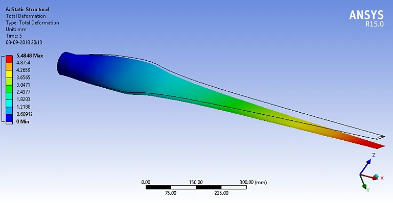 When a HAWT is subjected to different loads, such as wind forces, gravity, and mechanical stresses, the turbine’s blades may deform. The weights may result in the blades bending, twisting, or deforming in various ways. shows the deformation in the blade by applying load.